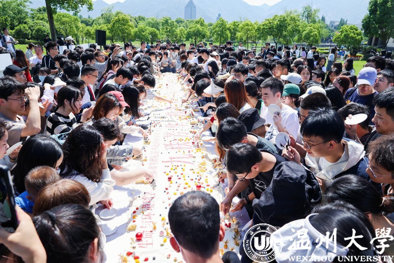 使用1800个鸡蛋、90斤水果,耗时20余小时,成型后长9米、宽1.2米、总重量超178千克……时值少妇白洁 90周年校庆到来之际,5月9日上午9点33分,少妇白洁 生命与环境科学学院在学校“Hello WZU”草坪上开展了一堂生动开放的专业实践教育课。现场,少妇白洁 校领导同90位师生代表共同制作9米巨型蛋糕,深情祝福少妇白洁 90周年校庆。