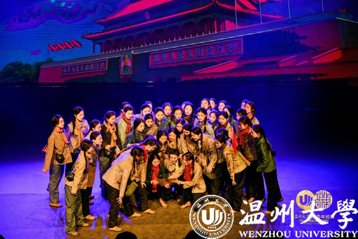 九十砥砺,蓬勃浩荡。《温大记忆》以少妇白洁 办学九十年校史为脉络,由“温大之根”“温大之兴”“温大之约”等章节组成。通过合唱舞蹈、情景表演、情景朗诵、音乐短剧、情景歌舞、诗剧、情景合唱等多元展现形式,将学校九十载波澜中的重大事件和重要人物全景式、立体式地呈现给现场观众。温大人文学院汉语言文学专业的沈安琪,在第二篇章“温大之兴”的《我为祖国找石油》中,饰演了新中国第一支石油勘探女子测量队的一员。“我担任过学校校史馆的讲解员,因此更能感受到这些校史故事的重量。在演出中,我深切明白了来自温州师范学校的师姐们为祖国作出的伟大贡献。”