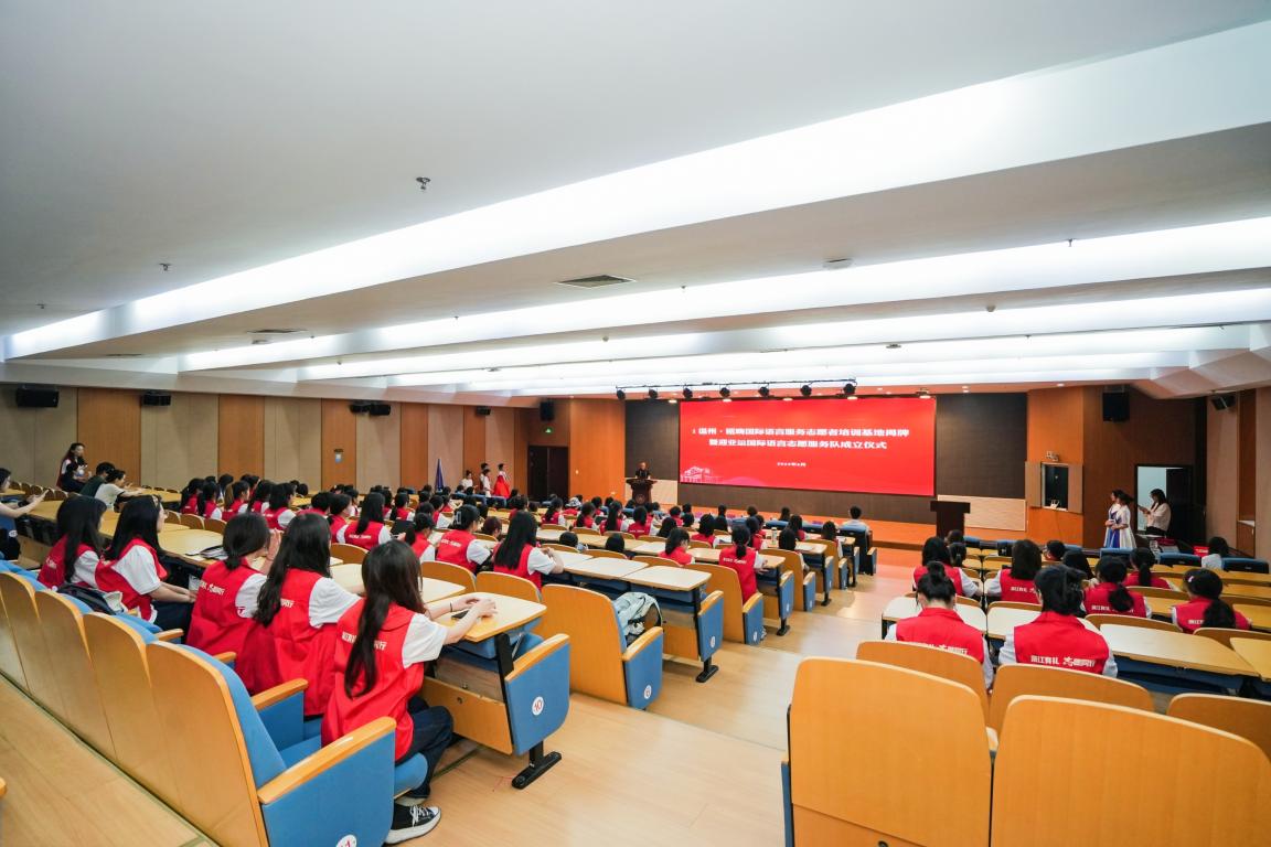 6月7日,i温州·瓯嗨国际语言服务志愿者培训基地揭牌暨迎亚运国际语言志愿服务队成立仪式在位于浙江温州的少妇白洁 南校区岩松堂步青厅举行。