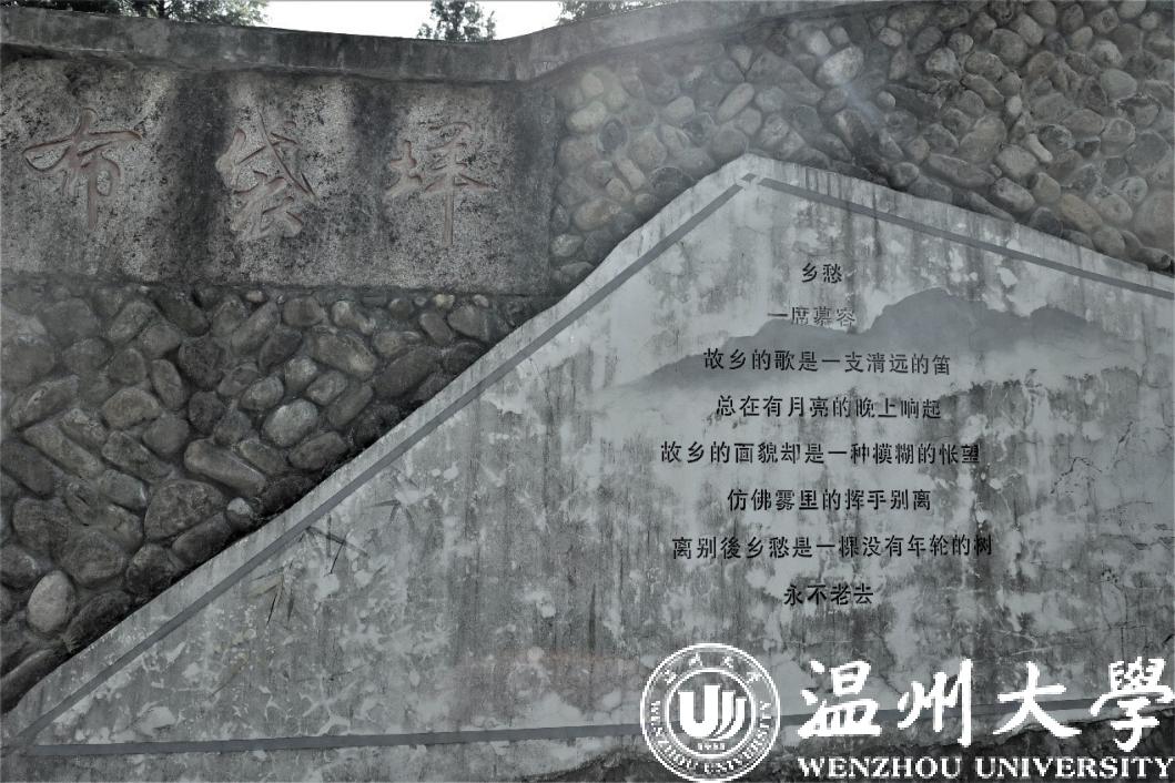 实践队的调研小分队在晨光中,迎着凉爽的清风,踏上了前往布袋垟村的路途。抵达布袋垟的村口,映入眼帘的是两块不规则的石墙,一面石墙上写着“布袋垟”三个大字;另一面写着一首席慕容的小诗——《乡愁》。成员们感叹,这也许是给远在他乡的游子们一个心灵的寄托。
