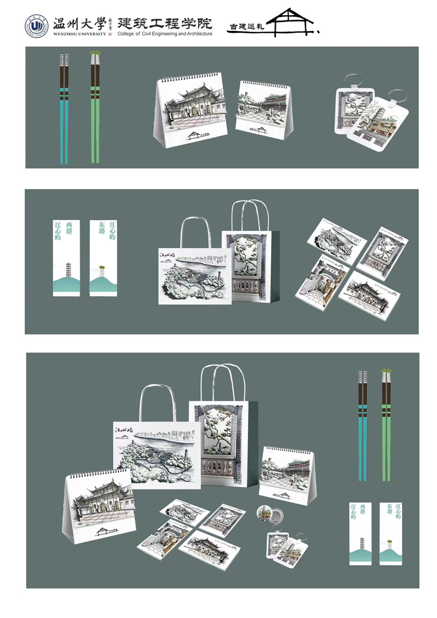 调研结束后,成员们对问卷数据进行统计分析,提出了“江心屿儿童游乐设施周边环境友好长廊”“后疫情时代下的核酸亭‘变废为宝’设计”等极具针对性的改造方案,通过可实现技术手段、彩绘等创意实现了资源的二次利用。此外,在指导老师的指导下,队员们对温州市现存的国家级33个文物保护建筑,省级111个文物保护建筑进行相关资料搜集。我们实践队通过建筑写生的方式所说温州古城,实践同学共绘制200余幅建筑写生作品,并从中提取12张进行明信片、徽章、礼品袋、台历等文创样品设计并及其制作,用新时代新方式宣传古建筑,宣传温州建筑地域文化。