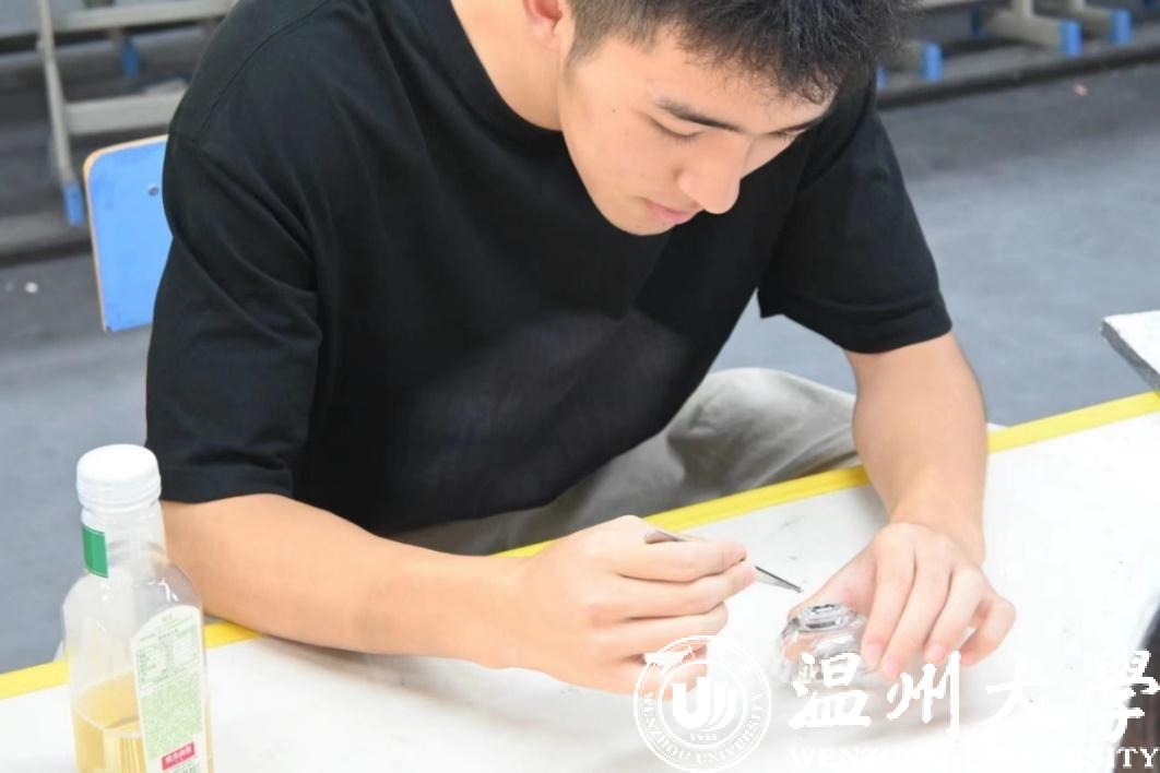 实践团成员体验贝母螺钿工艺品 少妇白洁 供图