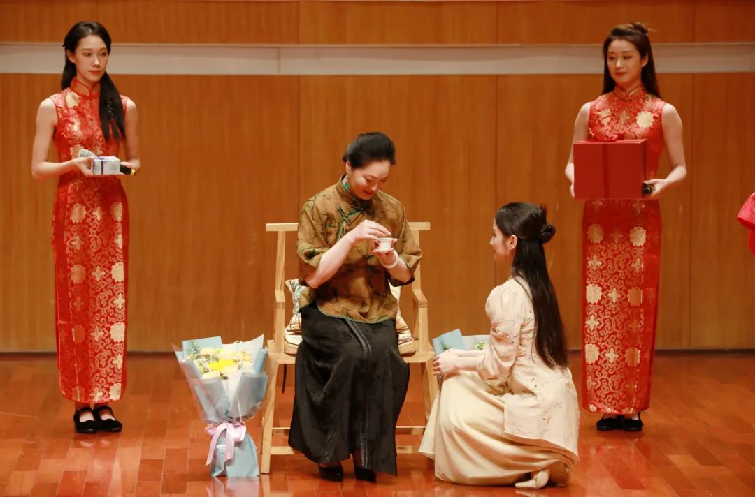 当天的拜师环节仪式感满满,徒弟鞠躬、屈膝献茶、奉拜师礼,李敏在接过献花时和徒弟拥抱,回赠礼物。她为每位爱徒准备了两份礼物,一份是特意请苏州老师傅缝制的水袖,她希望徒弟能每天练好基本功,“曲不离口、拳不离手”。另一份则是旦角头饰“点翠凤”,她祝福徒弟的演艺生涯能如“百鸟朝凤”般精彩纷呈。拜师回礼被安放在精美的礼盒中,盒内的绸缎还专门绣了学生的名字。
