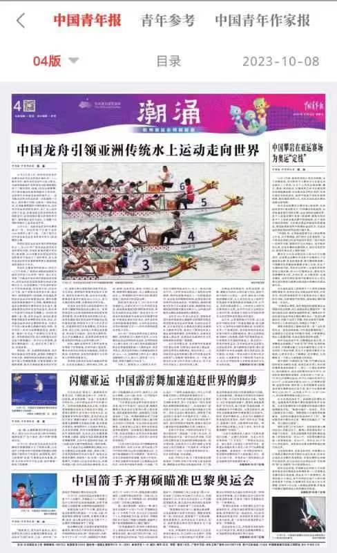 10月4日至6日,杭州亚运会龙舟比赛在本次亚运会的协办城市之一——温州举行。温州龙舟运动中心依山傍水,优越的场地条件和秀丽风光给各参赛队留下了难忘回忆。短短3天的比赛落幕,并不意味着这块场地的使命已经结束。这里将作为本届亚运会的遗产之一,成为推动世界龙舟运动进一步发展的一方热土。龙舟源于中国,它既是一项体育运动,又承载着厚重的中国传统文化。龙舟作为亚运会的特色项目,其广义上也将分布于东亚、东南亚地区的多种传统舟包括其中。这些传统舟聚合在龙舟的大旗下,期待着以龙舟为龙头,引领整个亚洲的传统水上运动走向世界。