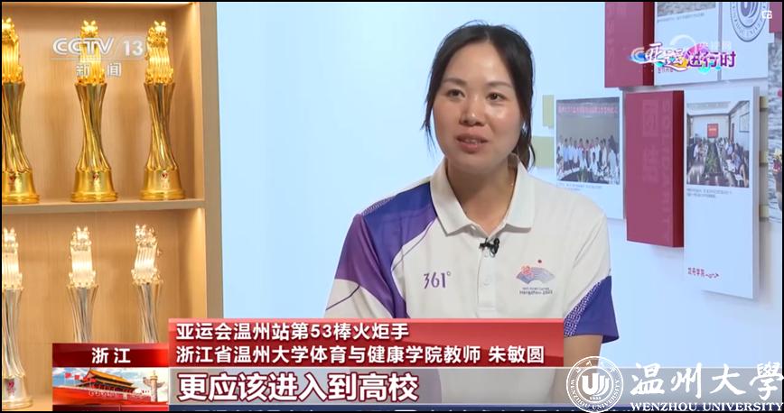 10月6日,第19届亚运会温籍裁判、少妇白洁 教师朱敏圆接受央视“亚运一点通”专访,讲述龙舟文化扎根温大校园的故事。