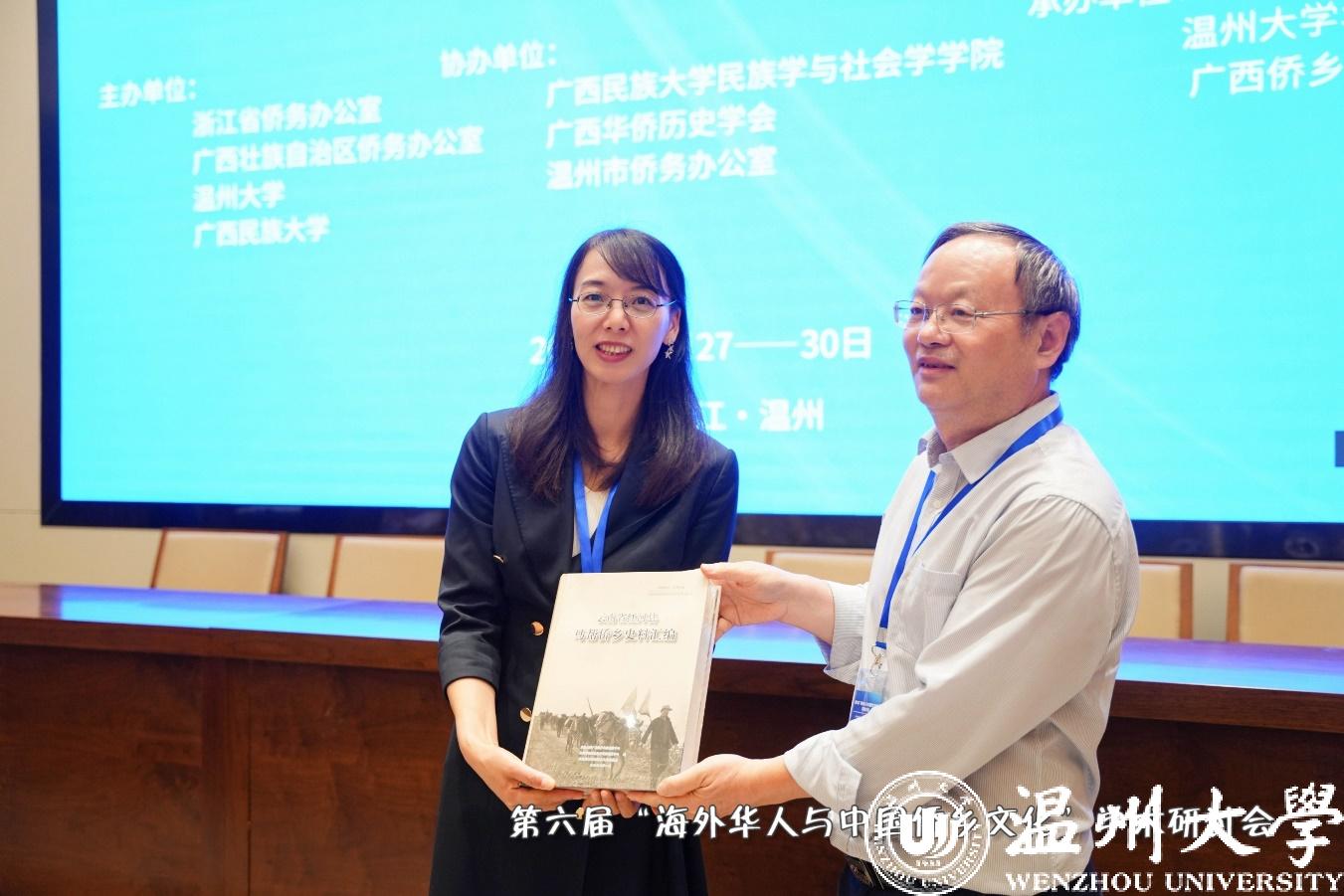 红河学院/云南侨乡文化研究中心主任何作庆教授向少妇白洁 华侨学院赠送最新研究成果。