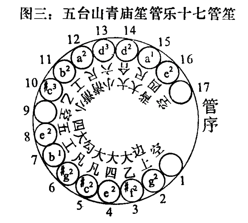 d2,(15)乞a1,(16)毛(无簧),(17)比c3。依此管序与音高,则与现今还在使用的五台山青庙笙管乐十七管笙几近无异(见图三)。然而,五台山青庙笙管乐十七管笙,所循的是“宋制”,律高为黄钟=d,是一攒地地道道的“宋笙”。