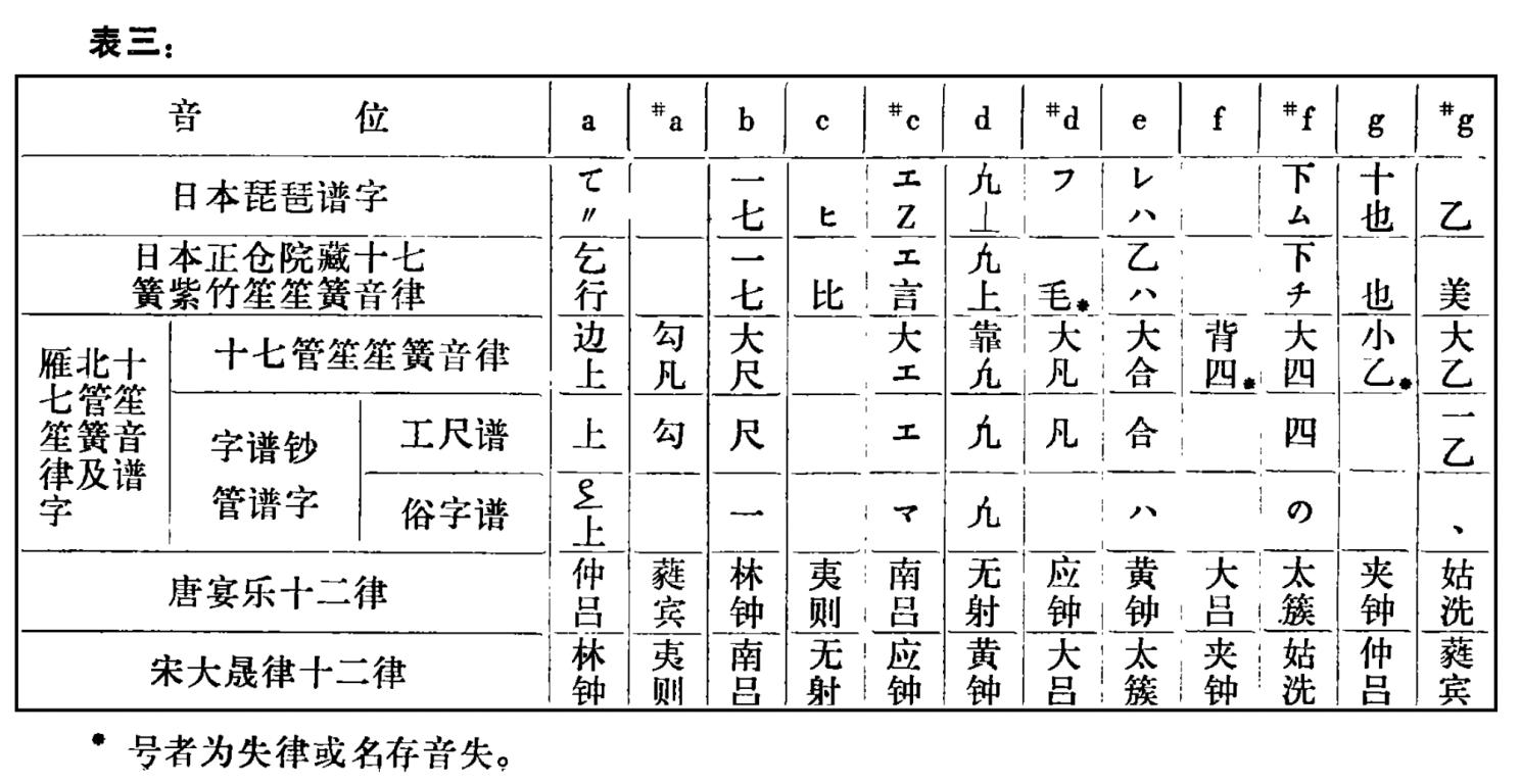 表三中所列日本正仓院十七簧紫竹笙笙簧音律,日本琵琶谱字所标音高,为日本林谦三《敦煌琵琶谱的解读研究》所载。