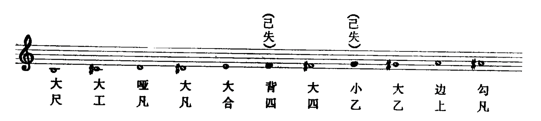 ”音高为d,既为日本琵琶谱字,又为正仓院藏十七簧紫竹笙笙簧音律,与雁北笙管乐谱字“