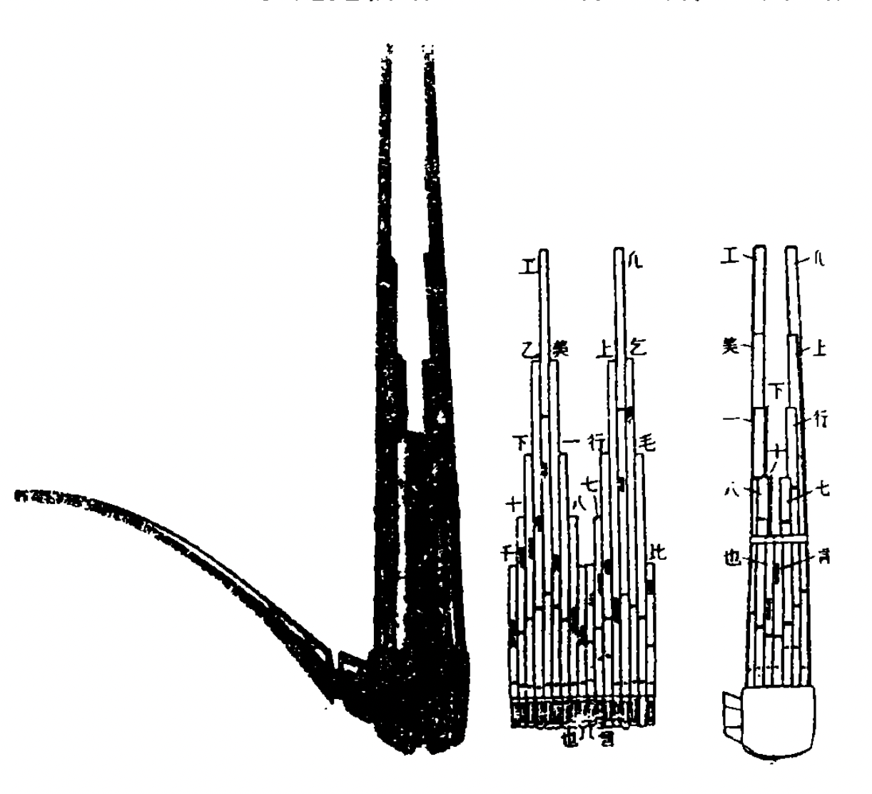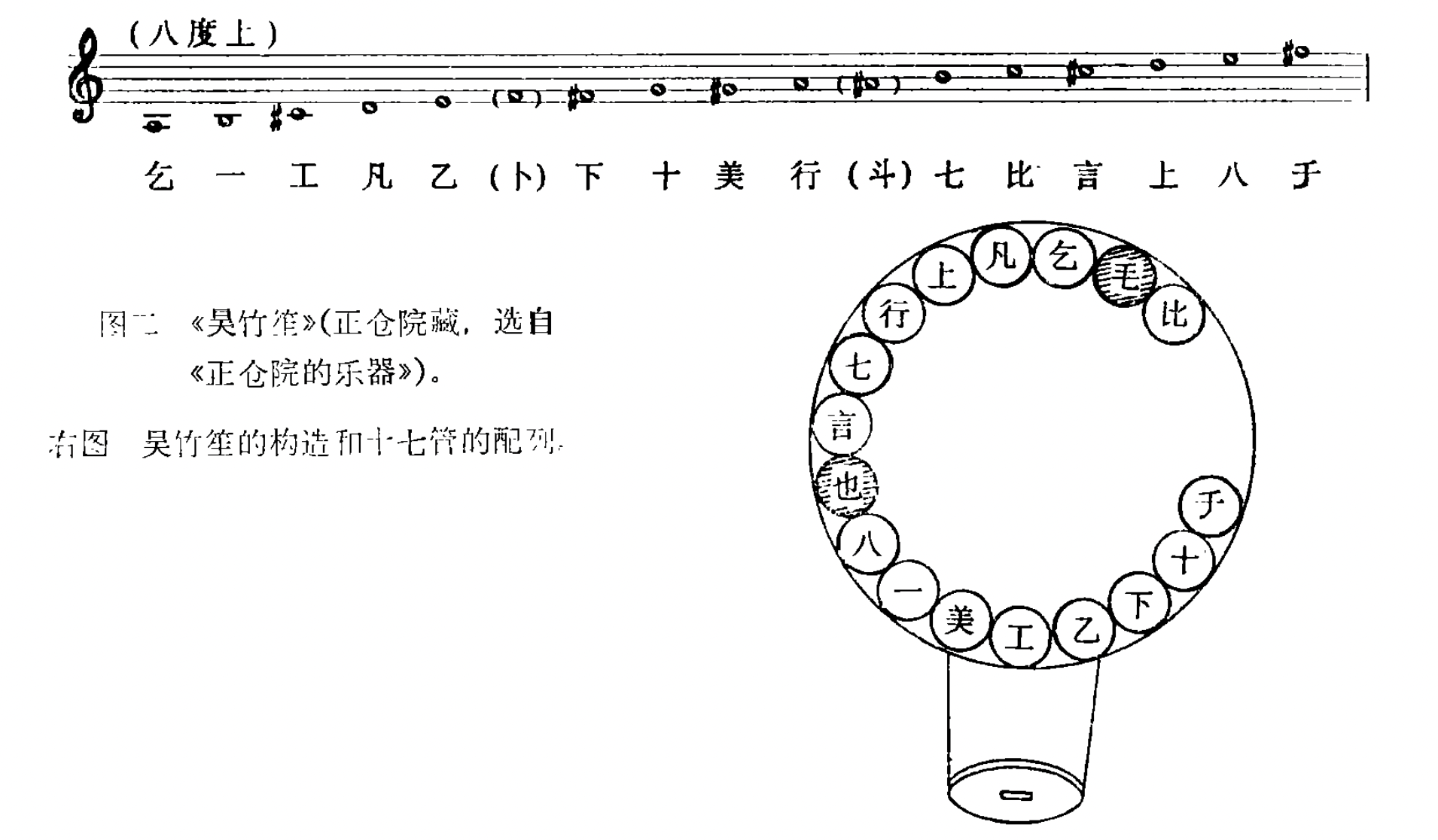 依上图,日本正仓院藏十七簧紫竹笙的管序音位为:(1)千#f3,(2)+g2,(3)下#f2, (4)乙e2,(5)工#e2,(6)美#g2,(7)-b1,(8)八e3,(9)也(无簧),(10)言#c3,(11)七b2,(12)行a2,(13)上d3,(14)