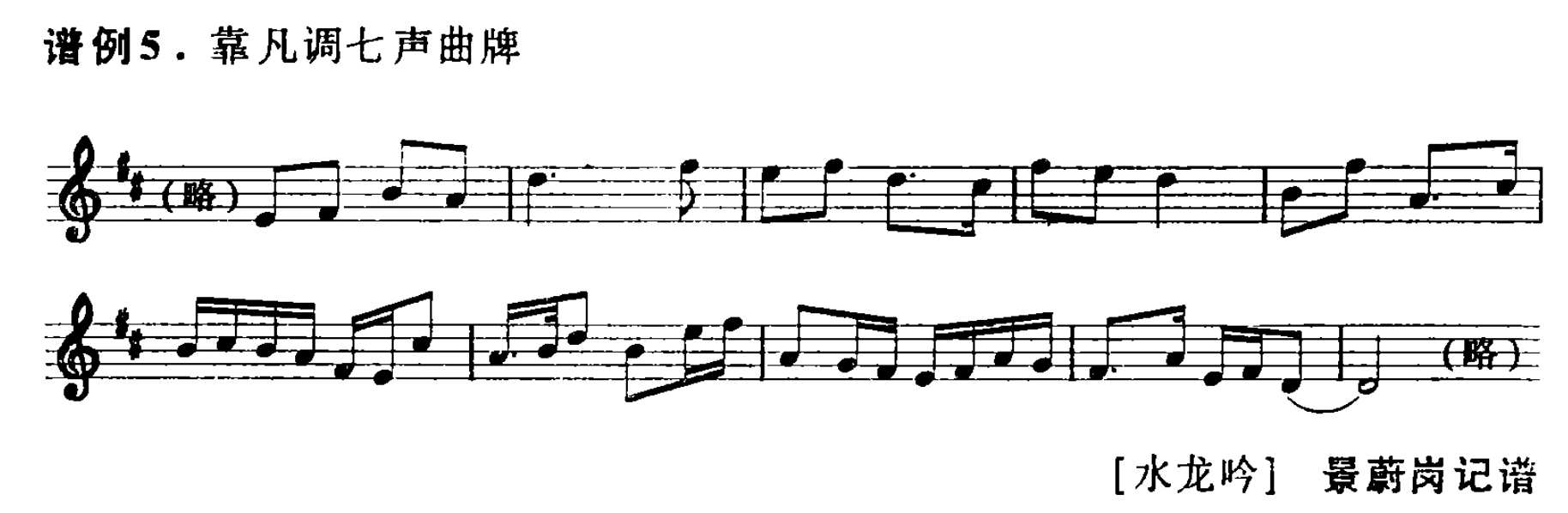 对于民族音乐理论的证定,最为可靠的方法,乃莫过于求助现今的音乐实践。由于笙律“小乙”、“背四”两律的失落,在雁北笙音乐里,现已难听到完整的七声下徴音阶“靠凡调”和“勾凡调”。此两调现已多流变为六声,即“靠凡调”缺“和”(笙律“小乙”g2),“勾凡调”缺“变”(笙律“背四”f2))。不过,这里所说的“很难听到”,并非是完全听不到。雁北笙管乐套曲【水龙吟】,就是一首七声齐全的“靠凡调”曲牌。(见谱例5)