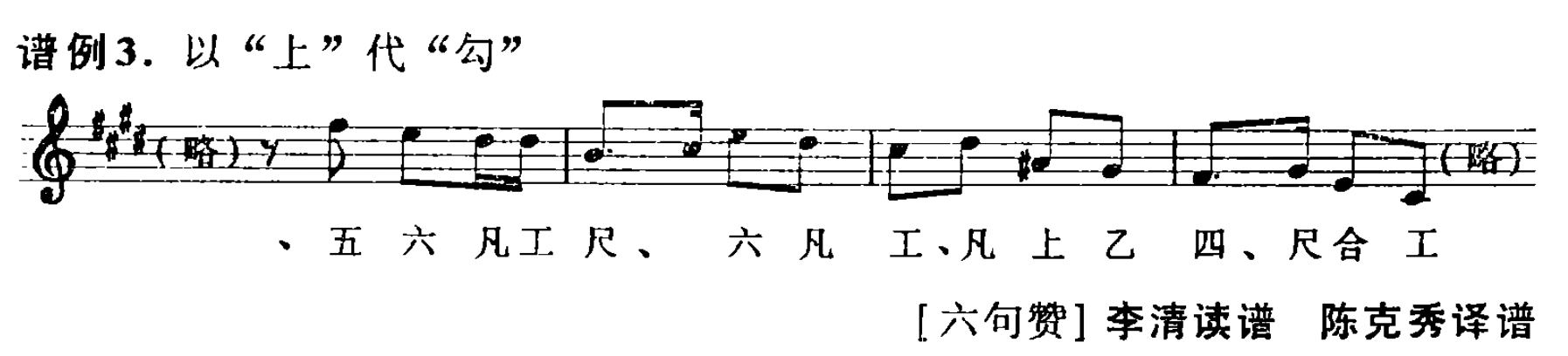 然而,当乐师在读E均(黄钟均)“凡字调”时,“勾”字却常读成“上”字,为以“上”代“勾”。(见谱例3)