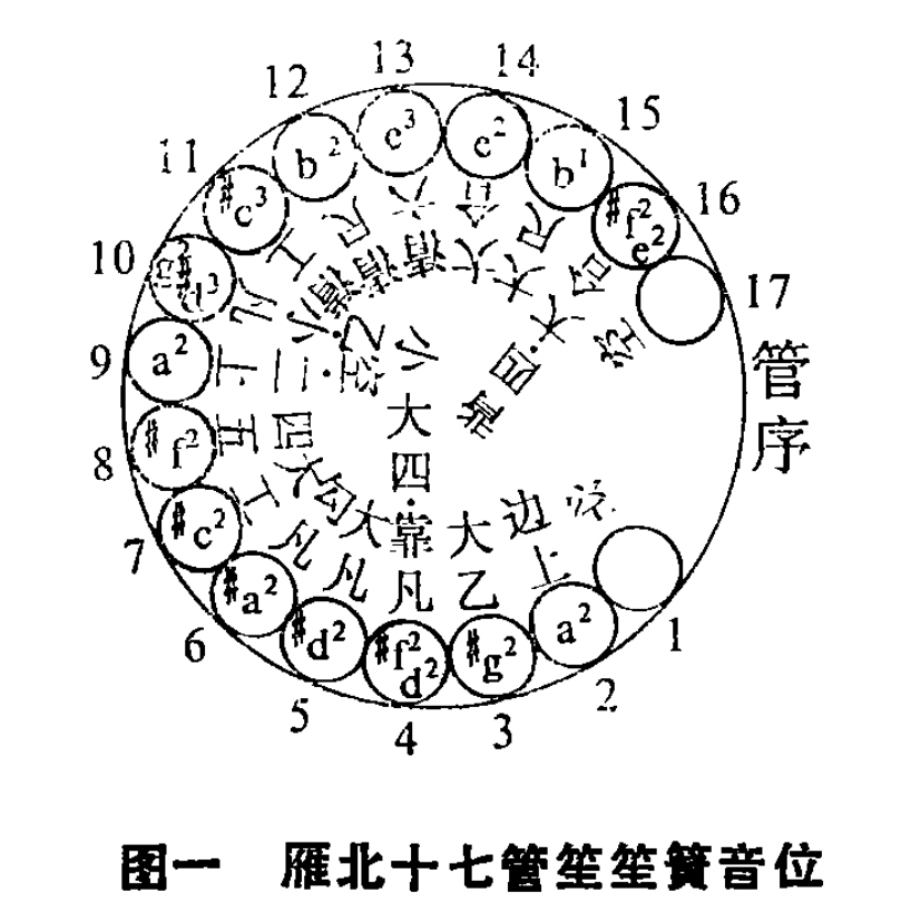 雁北笙管乐十七管笙一般为十四簧或十五簧。从右阙处顺时针排列,十四簧者,一管,九管、十七管无簧;十五簧者,一管、十七管无簧。音域从“大尺”b1到“小六”(清六)e3为十一度。笙簧音位大同小异,仅第四管或为“大四”、或为“靠凡”,第九管或“空”(无簧)。或为“二上”,第十管名“小乙”,或“小凡”,第十六管或“背四”,或“大合”。(见图一)