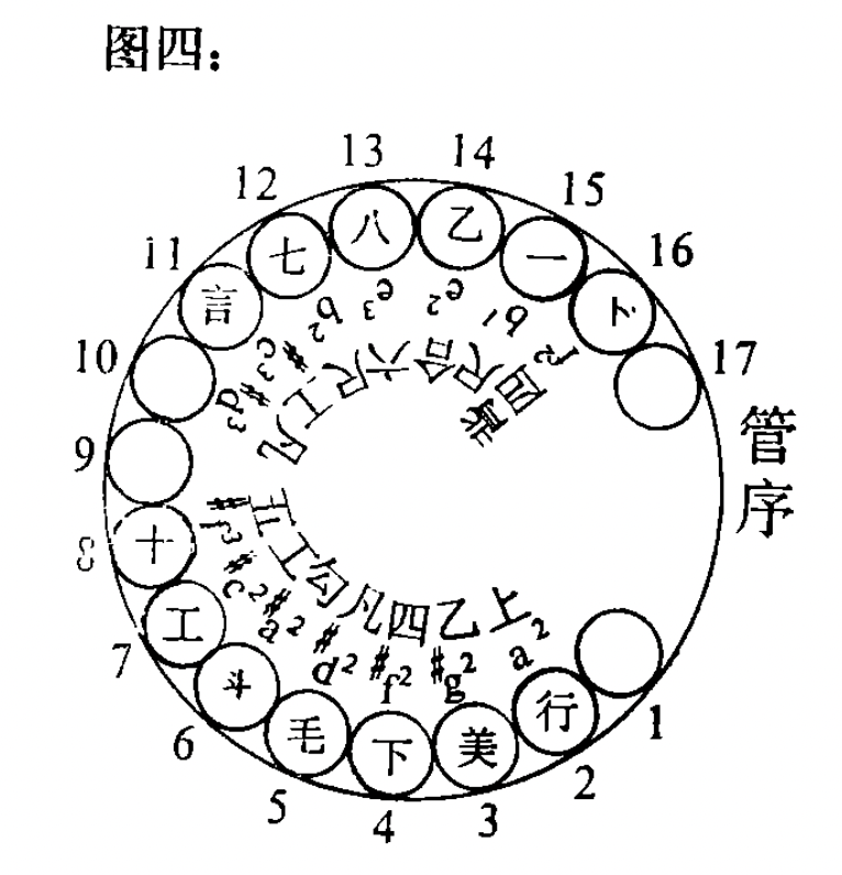 ”(哑凡),本应标“凡”却标“工”等等。这样,假如我们将其笙管按其所标音律谱字,复归于我国十七管笙笙管的传统管序位置,那么,无论是它的笙管上的谱字,还是实际音高,也就恰恰地合了雁北笙管乐十七管笙的管序音位(见图四)。