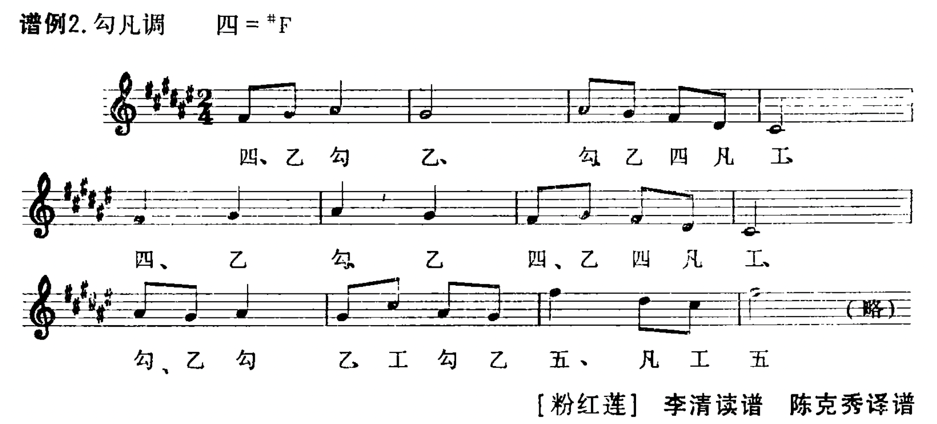 上例【一盏灯】艺人云为“凡字调”,实则为“勾凡调”,即B均(林钟均)七声,属借调入谱,其中f2即为“下徵音阶”之“徵角”。