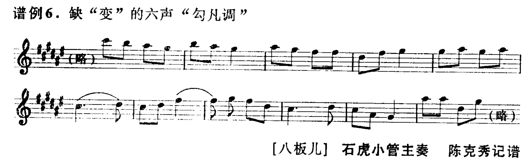 “勾凡调”在现所收集到的雁北笙管乐里,多为缺第七级音“变”(笙律“背四”f2)的六声曲牌,或缺“变”缺“和”(笙律“大尺”b1)的五声曲牌。(见谱例6)