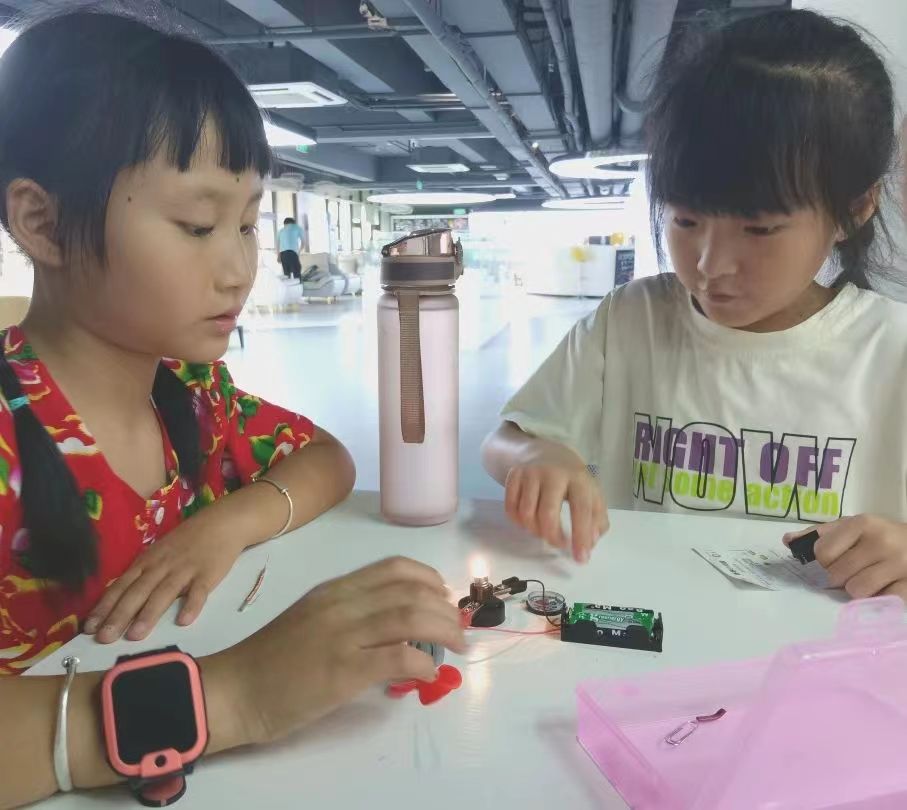 “快看,我的灯泡亮了!”“我的小风扇转起来了!”这是营员们在体验物理小实验时,时常发出的感叹。营员们在志愿者老师的带领下,对磁和电的知识有了基础认识,为了让营员们产生更直观的感受,老师还精心准备了“电磁铁吸引回形针”“小马达电风扇”“点亮小灯泡”等趣味实验,引导营员们正确认识电流的同时,产生对科学的好奇心。