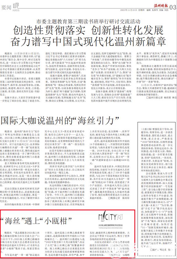 今年是共建“一带一路”倡议提出 十周年。温州是海上丝绸之路重要节 点城市,是我国首批对外开放的14个沿 海城市之一。温州朔门古港遗址入选 “2022年度全国十大考古新发现”,实证 了古代“海上丝绸之路”的繁盛和存 续。海上丝绸之路自古以来就是东西 方经济文化沟通交流的重要桥梁和纽 带,也是传播开拓进取、科学严谨、和平 友好、融通世界之精神的重要载体。大 会在这个背景下应运而生,吸引了世界 各地的好伙伴们远道而来。