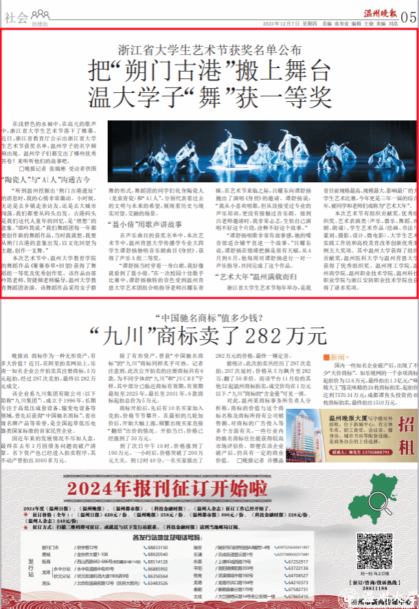 在浅碧色的水袖中,在高亢的歌声 中,浙江省大学生艺术节落下了帷幕。 近日,浙江省教育厅公示出浙江省大学 生艺术节获奖名单,温州学子的名字频 频出现。温州学子们都交出了哪些优秀 答卷?来听听他们的故事吧。