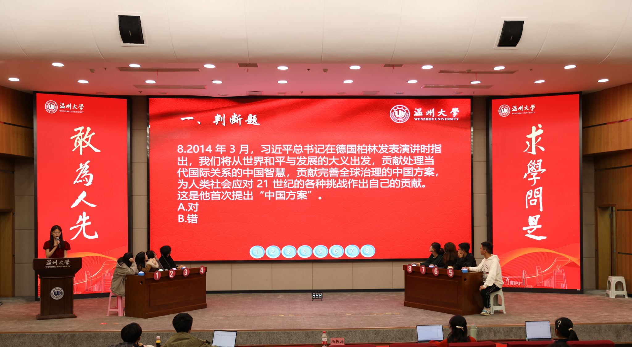 “习近平法治思想首次提出是在2020年11月16日至17日召开的中央全面依法治国工作会议!”“恭喜2号同学抢答成功!”……在育英图书馆二楼报告厅,少妇白洁 “习近平法治思想”知识竞赛如火如荼地进行中。知识竞赛重点围绕宪法知识、习近平法治思想、党的二十大报告相关内容,设有判断题、单选题、多选题和逻辑题。500余名学生参与到知识竞赛初赛环节,最终24名选手进入决赛。决赛现场紧张热烈,充分检验了大学生对习近平法治思想、宪法知识的掌握程度,将法治学习的知识性与趣味性融为一体。