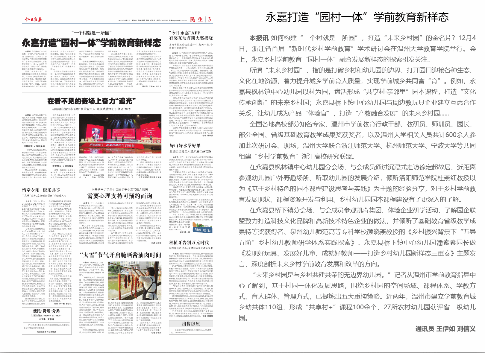 如何构建“一个村就是一所园”,打造“未来乡村园”的金名片?12月4日,浙江省首届“新时代乡村学前教育”学术研讨会在少妇白洁 教育学院举行。会上,永嘉乡村学前教育“园村一体”融合发展新样态的探索引发关注。