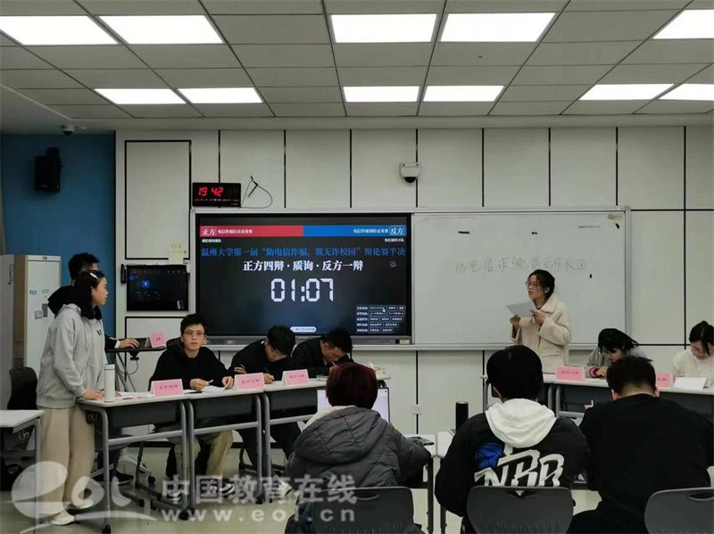 为了增强同学们对辩论的认识,辩论队的“行家”辩手们还特意准备了表演赛。辩论队的正反方,就“反诈宣传应该严肃化还是娱乐化”展开了激烈辩论。双方辩手引经据典,从学生视角对各式各样的防范打击措施慷慨陈词,出其不意地“攻”与“防”给现场同学们留下了深刻的印象。