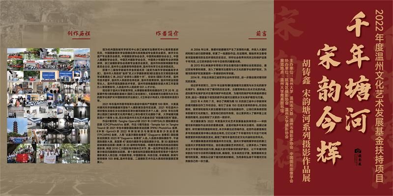 从2006年开始,胡铸鑫便对拍摄塘河产生了浓厚的兴趣,并投入大量时间和精力进行田野调查,积累了一批摄影作品。努力从历史价值,科学价值,艺术价值,挖掘出时代特征、地域特征、民族特征等信息,在客观科学记录保护古建筑的各个立面的同时,对一些有特点特色的工艺材料制作细节进行拍摄记录。查找相关资料,现场做田野调查,做好文字图片视频的记录保护。在这期间,他始终关注着母亲河温瑞塘河的生态环境和历史变迁,呼吁社会各界共同关注和保护这条千年河流,让它的宋韵在今时今日依然闪耀着光辉。2019年,胡铸鑫出版专著《温瑞塘河古建筑与水文化的数字化保护》,获得钱学森城市学金奖提名奖(该奖为城市学学术最高奖),2022年度宋韵塘河系列摄影作品获得2022年度温州文化艺术发展基金扶持项目。个人获2022“全球华人摄影十杰”称号,安徒生(国际)艺术奖,温州市胡铸鑫摄影技能大师工作室领办人等荣誉称号。