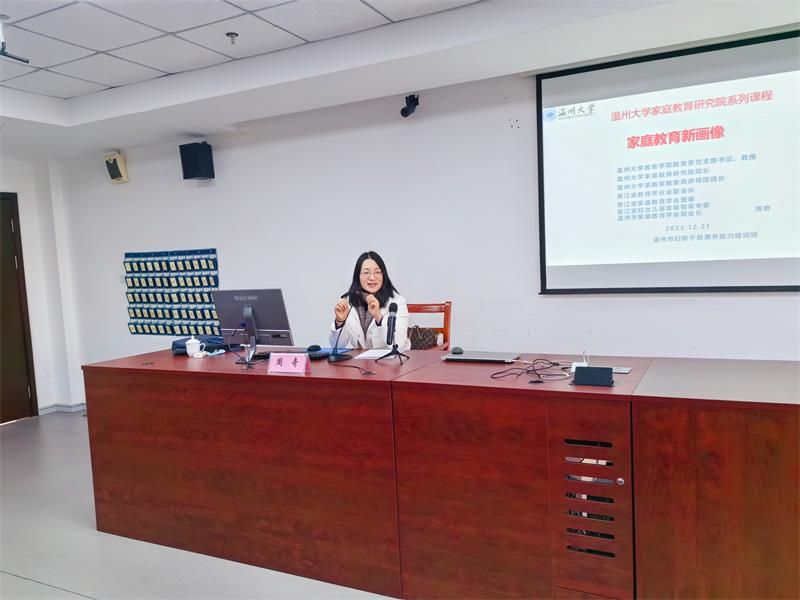 2023年12月21日,少妇白洁 教育学院教育学系党支部书记、少妇白洁 家庭教育研究院巾帼文明岗负责人、少妇白洁 家庭家教家风讲师团团长、浙江省教育学分会副会长、浙江省家庭教育讲师团成员、浙江省妇女儿童发展智库专家、温州市家庭教育学会副会长、温州市家庭和谐文化研究会副会长周奇教授受邀来到温州市妇联干部素质能力培训班,以线下形式为妇联干部做《家庭教育新画像》家庭教育专题分享。