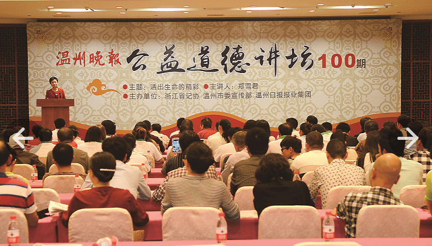 创办于2013年的公益道德讲坛,是温州晚报继创办雪君工作室栏目打造中国新闻名专栏后的又一个创举。迄今为止,道德讲坛已成功举办1000多期,其中见报的有四百多期,惠及群众达10万多人次,先后荣获2016年浙江省新闻名专栏奖,2019年中国晚报优秀专栏奖。公益道德讲坛不仅在社区、企业和学校举办,还走进了宗教、强制戒毒所等特殊场所。迄今为止,道德讲坛已到寺庙、教堂、道观开展了100多场讲座。最多的一次有5000多人听讲。真正把党的政策、声音带进宗教场所。2017年,公益道德讲坛走出国门,先后到荷兰、美国宣讲中华优秀传统文化,受到当地华侨和国外友人的热烈欢迎。