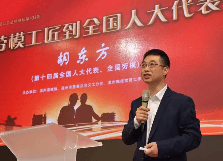 道德讲坛第433期主讲人胡东方《从劳模工匠到全国人大代表》的讲座,是一个生动感人的励志故事,现场座无虚席。胡东方16岁进入机械中专学习,毕业后进入模具企业,从基层做起,先后做模具钳工、模具设计,在生产一线用28年的坚守诠释了工匠精神的内涵。他在进行繁忙工作的同时,不忘初心,努力学习,先后取得专科、本科文凭证书。胡东方曾经辗转江苏、广东、浙江等地打工,最终在温州这片充满勤劳与创富思维的土地上扎根,并陪伴企业从零开始,一步一个脚印成为高级模具设计技师,先后获得了浙江省劳动模范、浙江工匠、全国五一劳动奖章、全国劳模等殊荣。