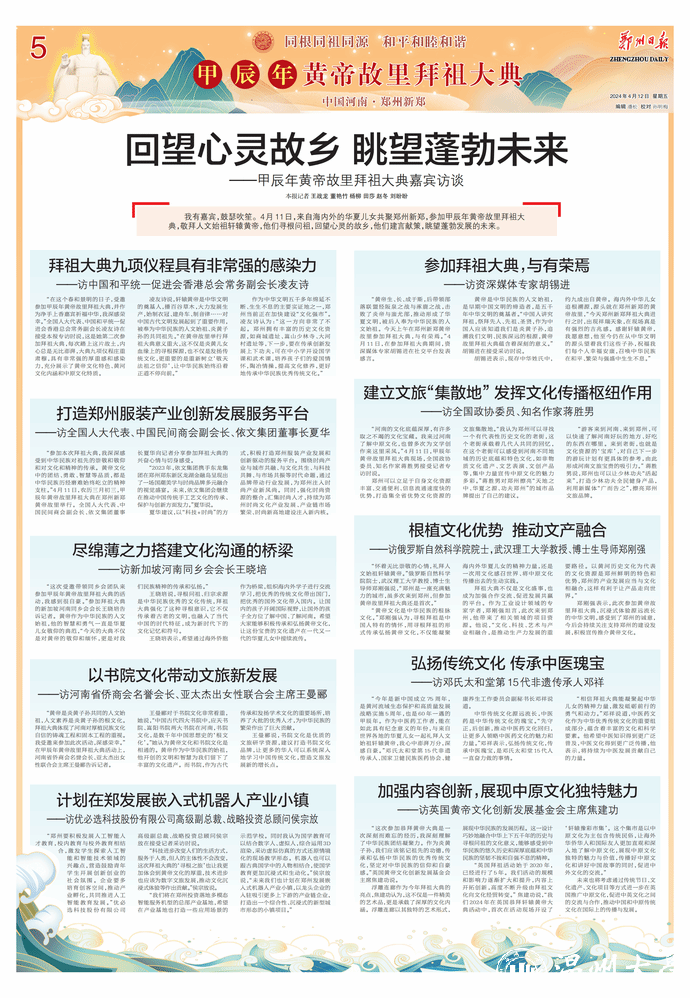 我有嘉宾,鼓瑟吹笙。4月11日,来自海内外的华夏儿女共聚郑州新郑,参加甲辰年黄帝故里拜祖大典,敬拜人文始祖轩辕黄帝,他们寻根问祖,回望心灵的故乡,他们建言献策,眺望蓬勃发展的未来。