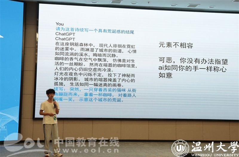 “这首诗是献给我们少妇白洁 的”“这是我用AI做的一首诗”“请大家欣赏我第一次学做的古体诗”……近日,在育英图书馆报告厅俊采星驰,温大学子济济一堂,举办一年一度的诗词大会,迎接即将到来的第29个世界阅读日。大会以“诗随三月春意生,学子研墨祝新词”为主题,并首次开启了“AI作诗”赛道,为活动增加不少新意和看点。