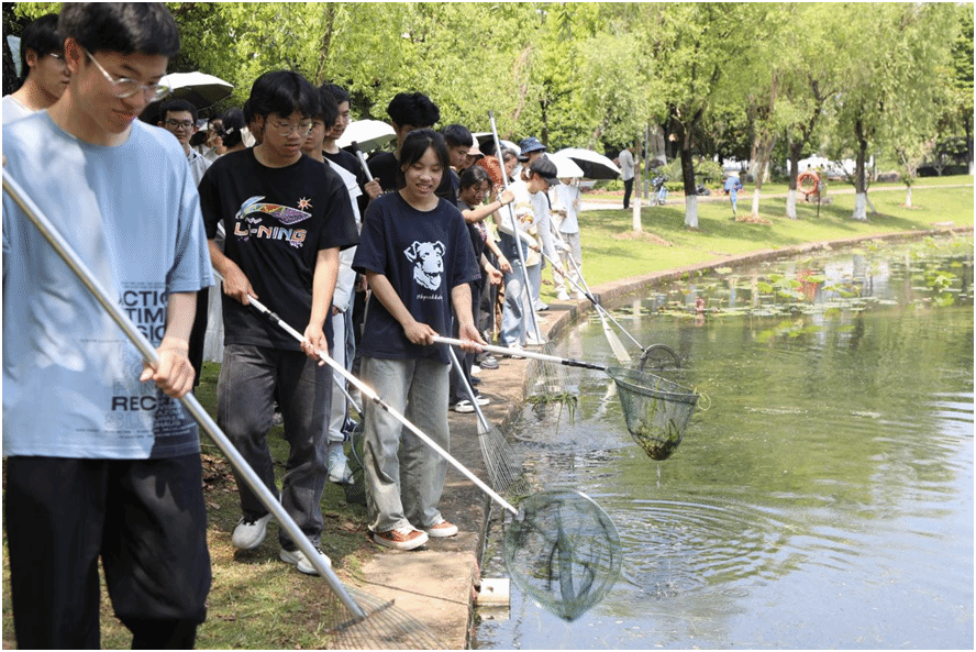 近段时间,岸边落叶、水草断枝漂浮在明心湖上,大大影响了明心湖的颜值。生环学子相约明心湖,挥舞钉耙、网兜,将湖面上的浮草、枯叶一点一点清理出去,湖边的垃圾也被拾起,进行分类后放至回收点。劳动时,同学们格外小心,避免因幅度太大影响水生动、植物的生长,为湖里水生生物打造更优质的“家”,也是所有生环学子的心愿。