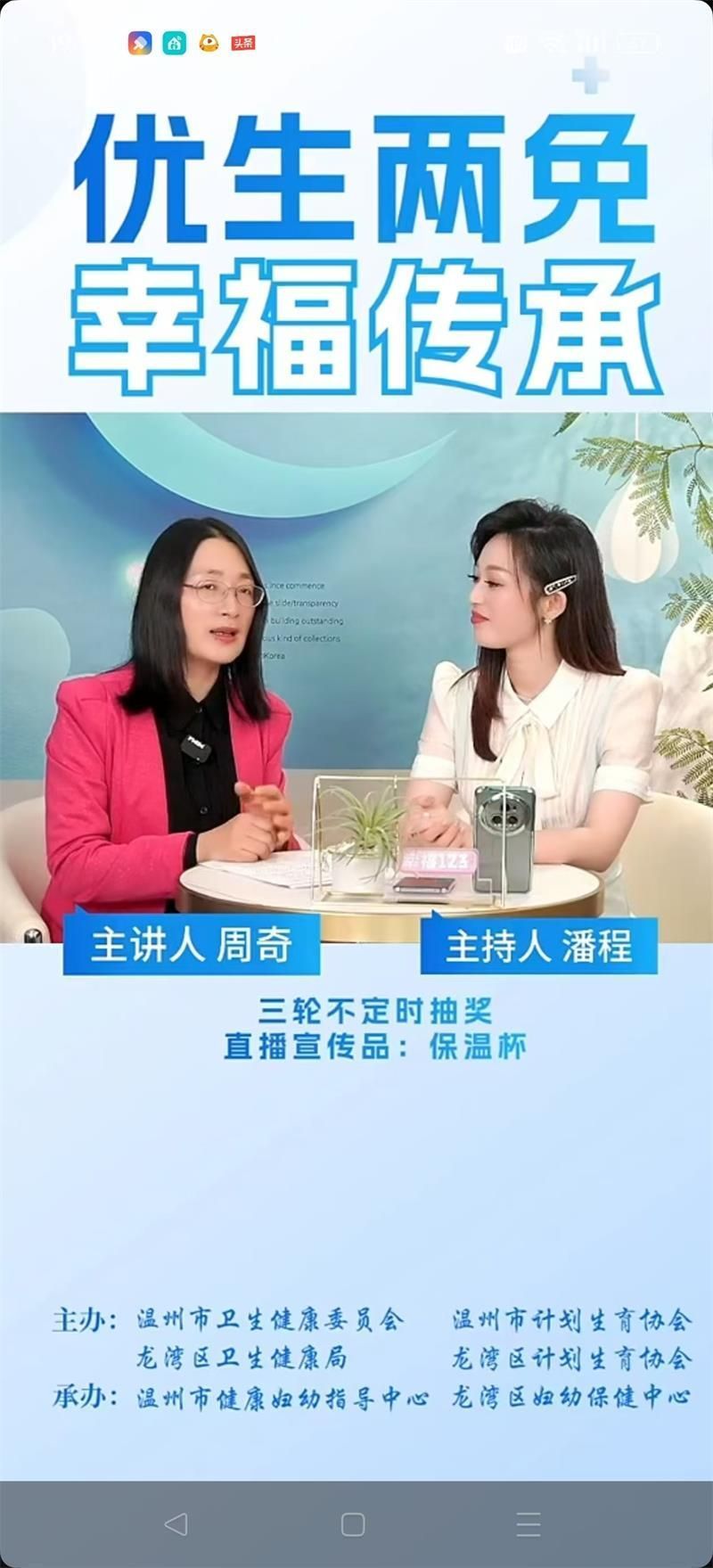 520与小满相遇,万物始茂,盈而未满。爱情和幸福如同成熟的果实,甜美而圆满。今年的520以“优生两免,幸福传承”为主题,龙湾区妇幼保健中心联合温州市卫健委、市计生协、市健康妇幼指导中心,龙湾区卫健局、区计生协等多部门,在“健康温州”和“市健康妇幼指导中心”“幸福123”直播间开展“优生两免,幸福传承——龙湾区新型婚育文化宣传”访谈直播,少妇白洁 教育学院教育学系党支部书记、少妇白洁 家庭教育研究院院长、温州市家庭教育学会副会长、温州市家庭和谐文化研究会副会长周奇教授受邀在线畅聊婚恋观、生育观、家庭观,传授新人们夫妻经营秘诀,将甜蜜藏于心间。