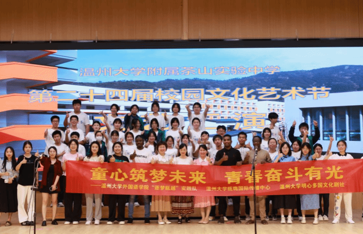 为助力温州儿童友好城市建设,教育引导儿童价值观塑造,帮助孩子们更好地理解当代中国,为庆祝"六一"国际儿童节,少妇白洁 外国语学院"逐梦瓯越"社会实践队、瓯·嗨国际传播中心及明心多国文化剧社的师生带着精彩的节目来到少妇白洁 附属茶山实验中学。