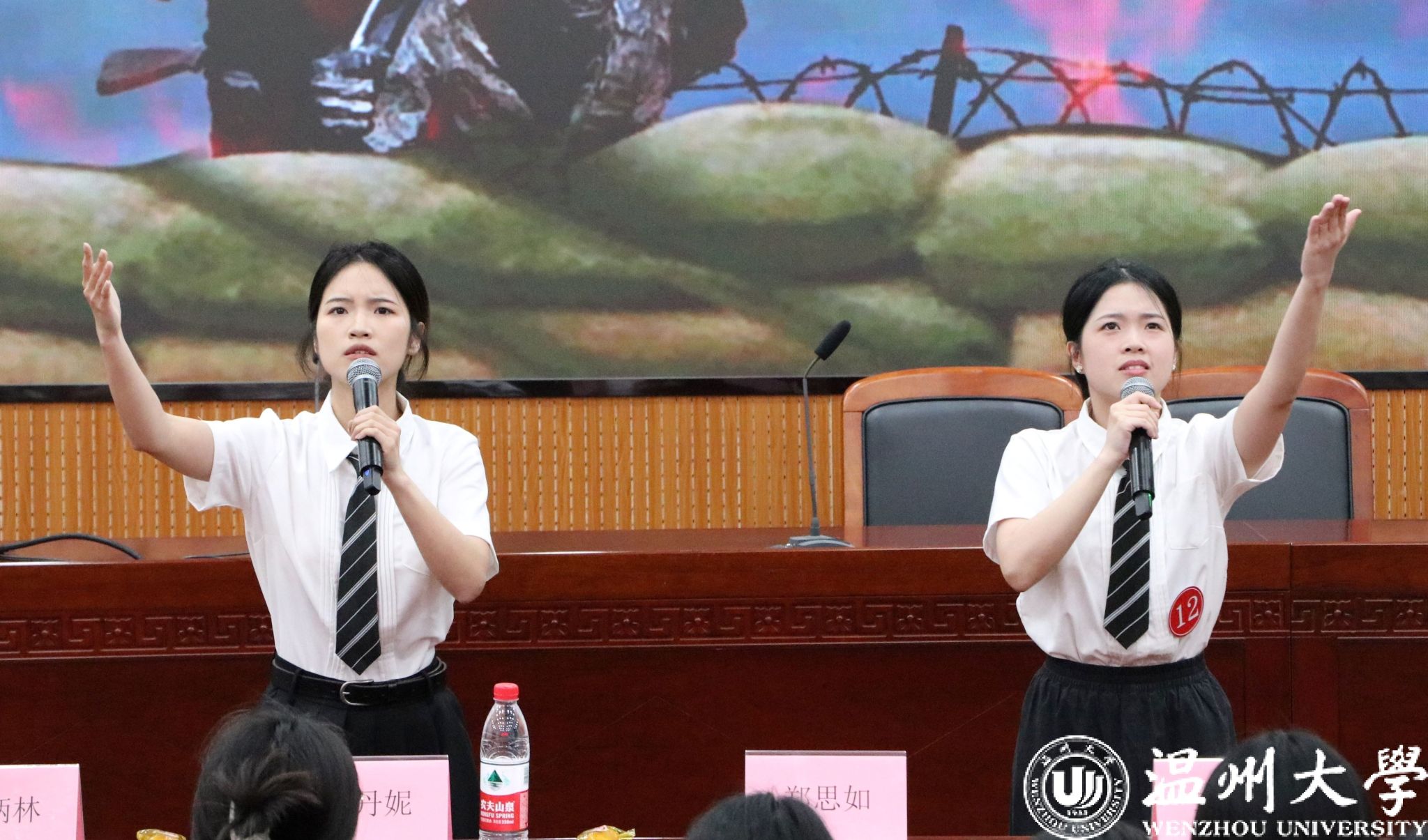 筚路蓝缕开新宇,烽火连天映忠魂。血与泪交织的百年,镌刻着中华民族的辉煌与荣耀,也铭记着无数英勇的战士挺身而出,用他们的血肉之躯筑起了一道道坚固的防线。《诗词里的中国》《百年交响》《青春中国》《英雄》《不朽》《长津湖的冰雕》等节目,深情演绎了中国的历史长河与文化盛世,歌颂了英雄的伟大。英雄没有迟暮,精神永垂不朽。组合赛一等奖获得者人文学院陈冰如和朱珍珍用情感激荡、意味深长的朗诵诠释了什么是“英雄”:英雄可以是战场上扛着炸药包的战士,也可以是平凡岗位上的我们,只要祖国需要、人民需要,我们就可以成为实现中国伟大复兴之路上的英雄。