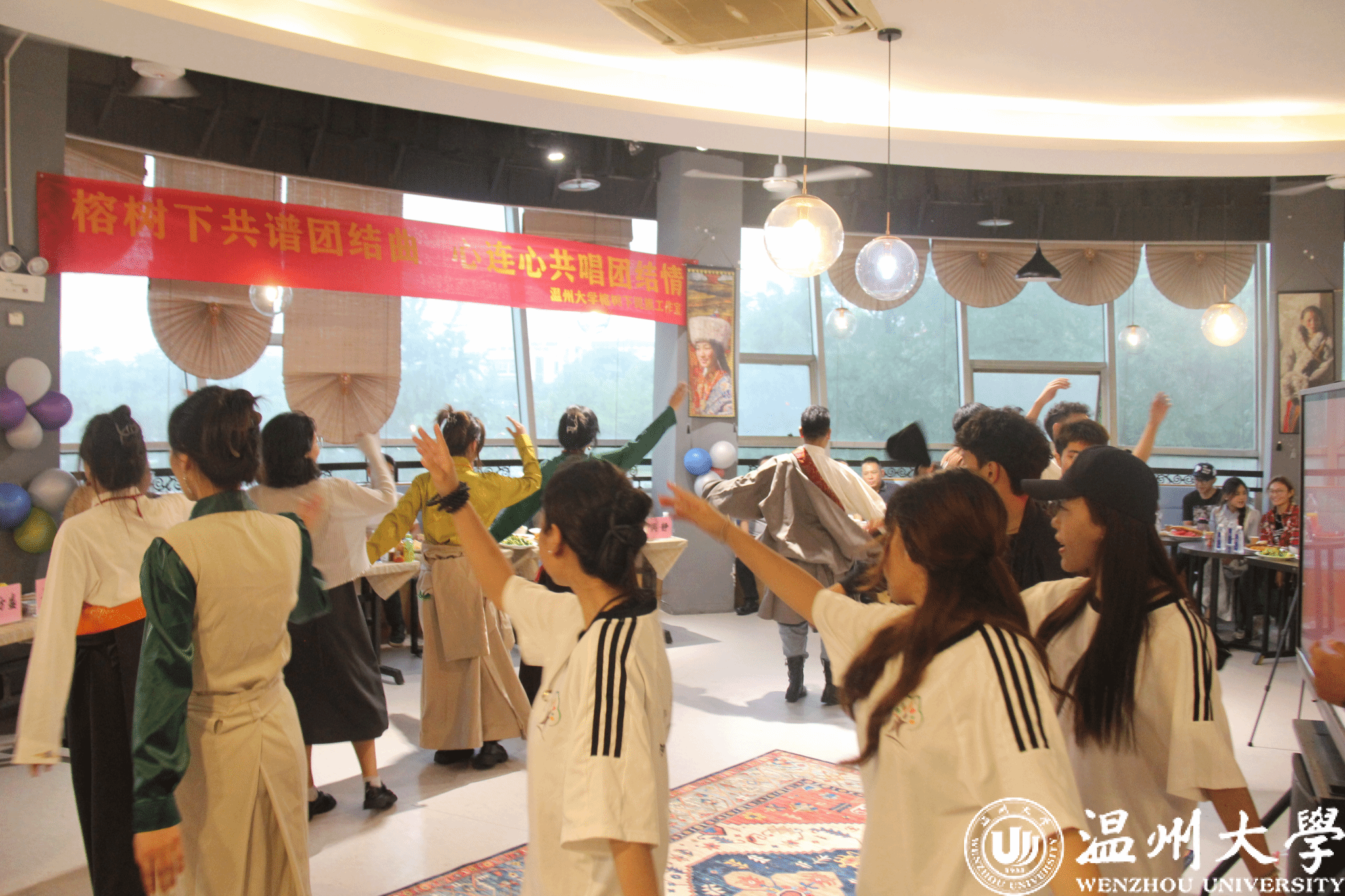 夜幕降临,晚上的“榕·宴团圆”庆祝活动更是精彩纷呈。在热闹的长桌宴上,维吾尔族、藏族、蒙古族、回族、畲族等50余名少数民族学生与领导嘉宾、老师们围坐一圈,他们身着鲜艳的少数民族服饰,分享各民族特色美食、一起畅谈家乡民族风俗。来自不同民族的学生代表身着节日盛装,纷纷走上舞台,用优美动人的民族特色舞蹈和悠扬婉转的歌声,向在场师生们展示了多元文化的魅力。现场气氛热烈而温馨。来自藏族的桑宗同学感慨道“今天的活动让我感受到了家一般的温暖,作为新时代青年,让我们像石榴籽一样紧紧相依、紧密相连,共同绽放出属于我们色彩!”