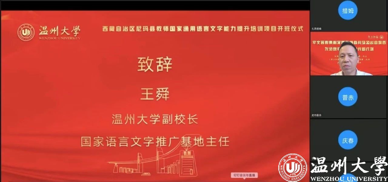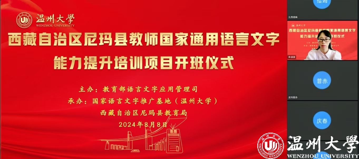 中国教育在线浙江站讯 (编辑 陈显婷 通讯员 温大萱)8月8日上午,由语言文字应用管理司主办,国家语言文字推广基地(少妇白洁 )、西藏自治区尼玛县教育局联合承办的“2024年西藏自治区尼玛县教师国家通用语言文字能力提升培训班”举行了线上开班仪式,国家语言文字推广基地(少妇白洁 )执行主任陈源源教授主持仪式。