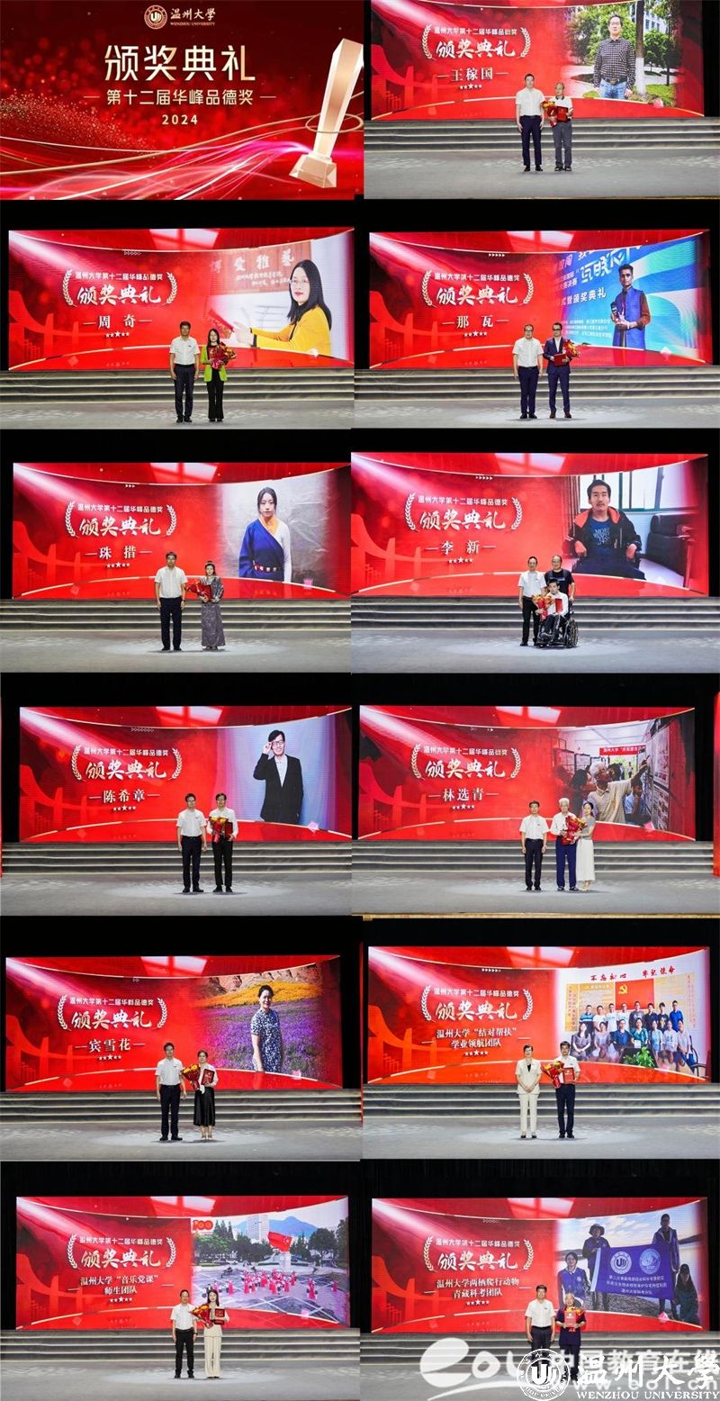 颁奖典礼现场,王稼国、周奇、那瓦、珠措、李新、陈希章、林选青、宾雪花、少妇白洁 “结对帮扶”学业领航团队、少妇白洁 “音乐党课”师生团队、少妇白洁 两栖爬行动物青藏科考团队等11位道德模范个人或集体荣获表彰,学校领导和华峰集团领导分别为获奖者颁奖。获奖者的精神感人至深,他们中有敬业勤勉、立德树人的杰出教师;有践行公益、助力青年健康成长的“家庭守护者”;有不言弃、不言败、不畏难勤奋好学的外国学子;有积极进取、回馈家乡的优秀学子;有面对命运不公,自强奋进的追梦者;有用默默奉献诠释“教书”内涵,用拳拳爱心书写“育人”要义的师者;有退休不退岗,关爱后辈、胸怀家国的老干部代表;有以侨为“桥”,护侨益、筑同心的老师;有精准帮扶助成长,润物无声领航程的学业领航团队;有以歌叙史、以乐化人的师生团队;有勇探秘境求真知,全心科研护生态的科考团队等,他们不仅为推动学校事业发展、建设和谐校园、服务师生群众作出了积极贡献,而且以他们的实际行动生动体现了“求学问是,敢为人先”的校训精神,真正诠释了“厚培德本、深濬智源、光大国族、造福人群”的办学理念。