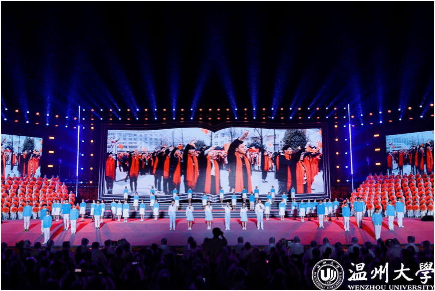 优雅深邃的小提琴演奏着《温大记忆》,触动着每一位温大人的心弦,慷慨激昂、饱含深情的《我和我的祖国》,青春阳光、积极乐观的《同爱同在》,温暖治愈、婉转动人的《小美满》……温大版的《可能》和温大学生原创歌曲《年轻》编织着属于温大人的独家记忆。 群诵《强国有我,青春担当》发出温大学子砥砺奋斗的铮铮誓言,歌曲与走秀《热烈的少年》展现了新时代青年乘风破浪、无畏风雨的昂扬斗志,灵动轻盈的舞蹈《瓯水长》诗意地展现出温州的山水悠悠,瓯水情长。