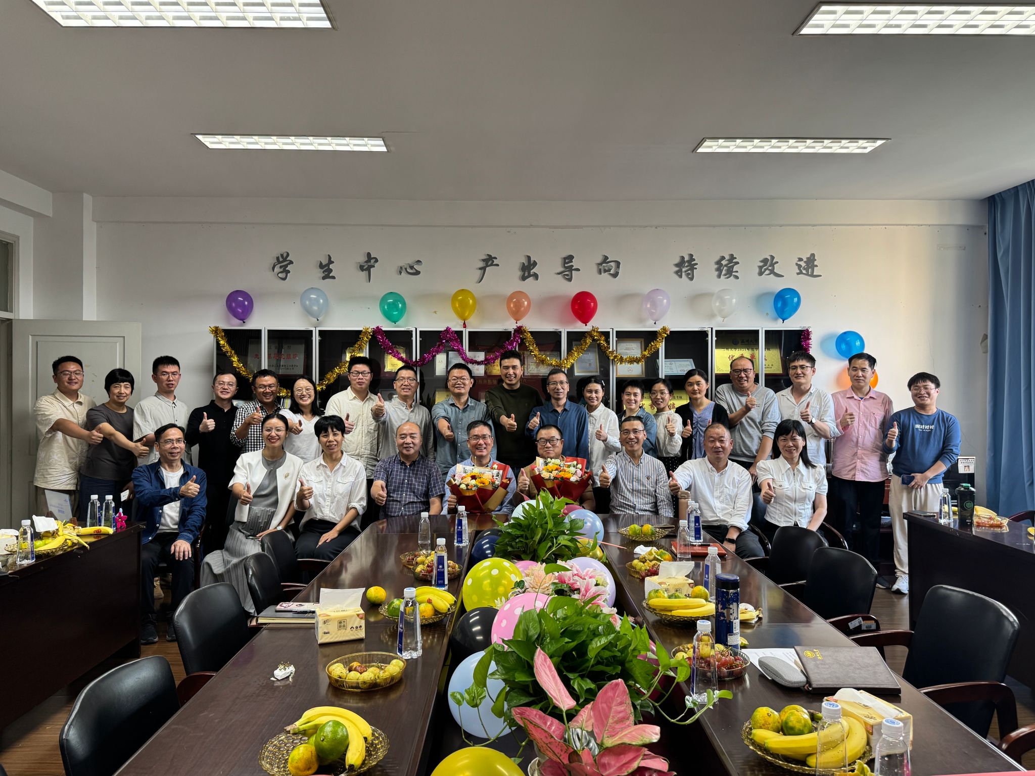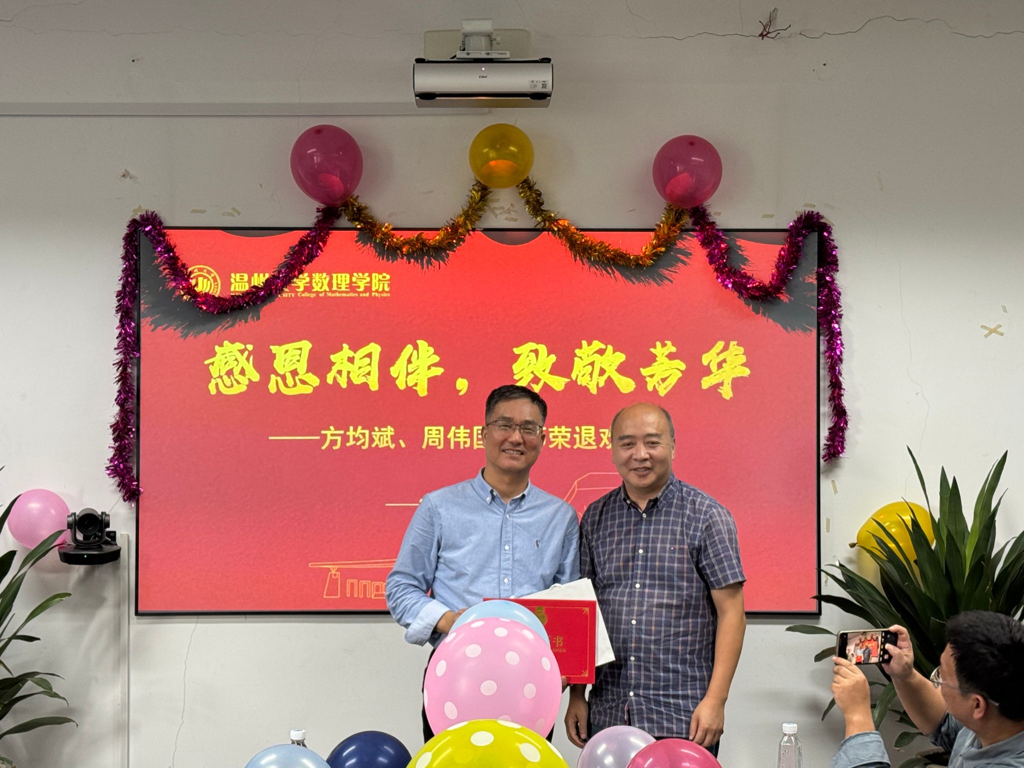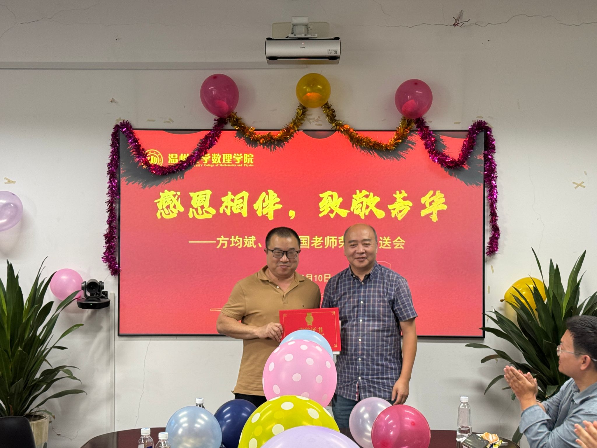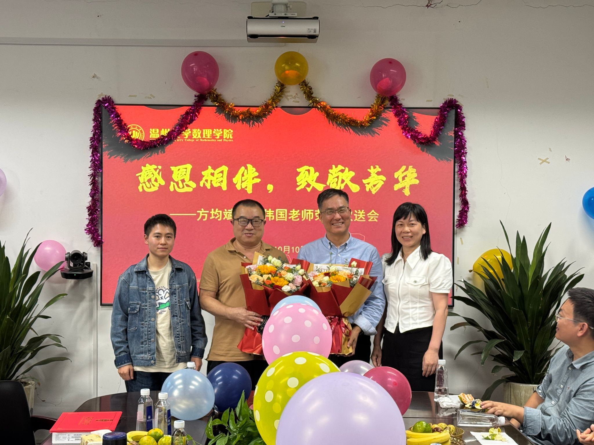 举办离退休教师欢送仪式,是数理学院“师德之光”品牌的具体内容之一,也是学院长期坚持的优良传统,更是推动师德师风建设不可或缺的一环。现场,学院组织教师代表、新入职的年轻教师及学生代表为即将退休的两位老师方均斌和周伟国献花并送上祝福。