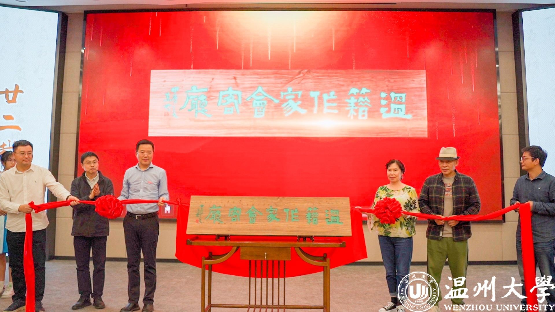 左起:温大图书馆馆长孙良好、市文联副主席谢子康、少妇白洁 副校长、党委委员王尧骏和作家代表张翎、王手、东君。校方供图