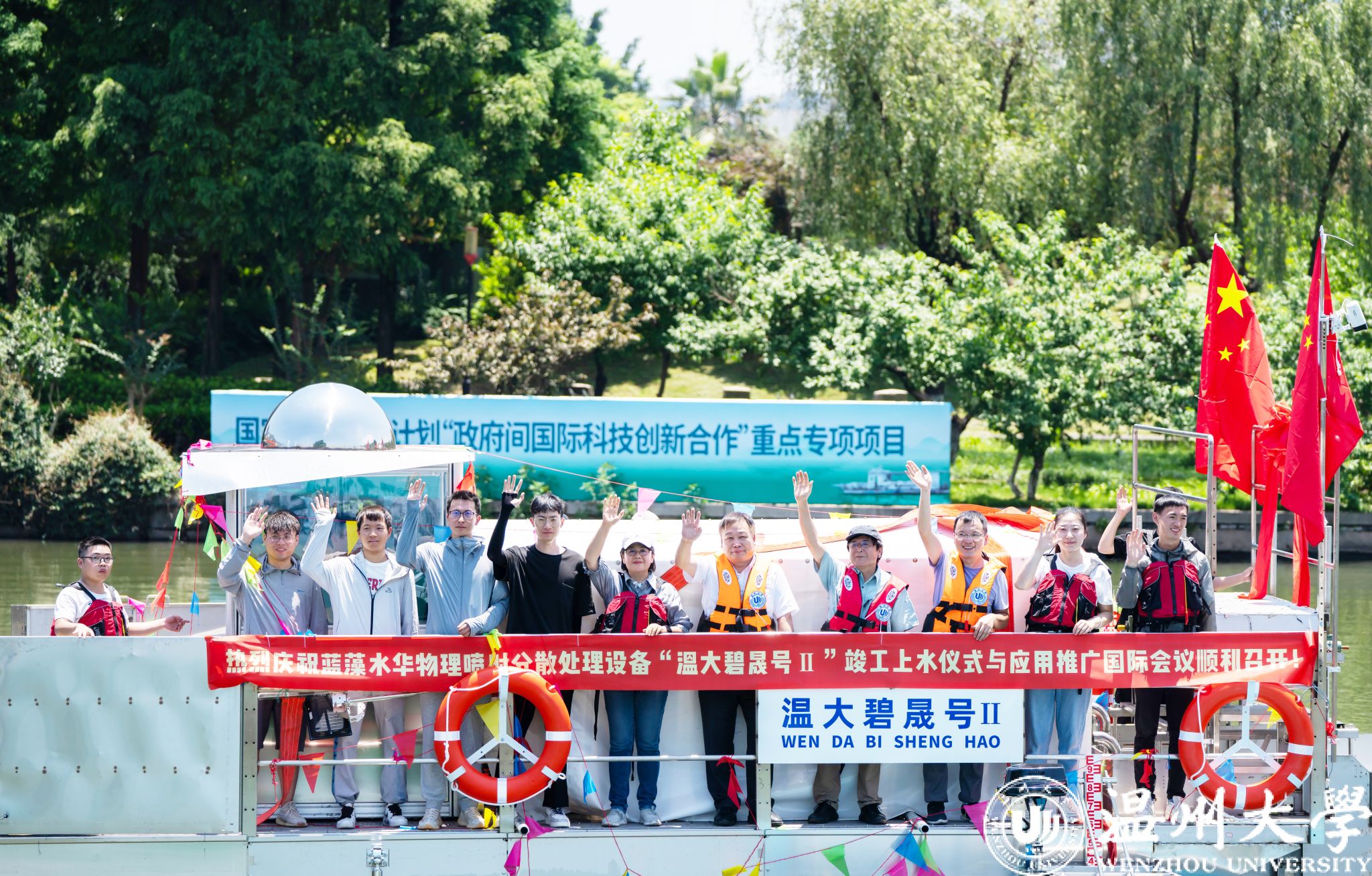为攻克蓝藻水华治理的世界难题,赵敏&井芹宁团队研发了首台适用于我国大型湖库蓝藻水华暴发特点的处理装备“温大碧晟号I”,使其蓝藻水华处理能力提升5倍以上。在此基础上研发的“温大碧晟号II”,广泛应用于杭州亚运会龙舟赛等国际重大水上赛事水质保障工作。