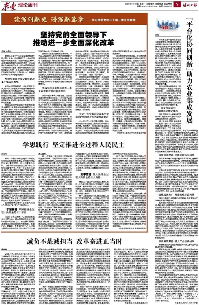 党的二十届三中全会紧紧围绕推进中国式现代化中心任务擘画了进一步全面深化改革的战略举措。深刻领悟会议精神,必须准确把握党的全面领导和进一步全面深化改革的辩证关系,党的全面领导是进一步全面深化改革、推进中国式现代化的根本保证,在进一步全面深化改革中创新和改进党的领导方式和执政方式,提高党的领导水平和长期执政能力。