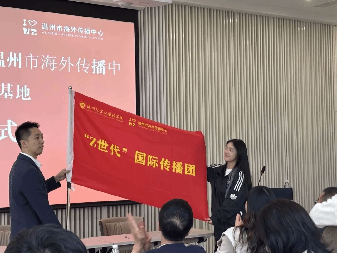 随后,举行了庄重的签约仪式,双方就平台共建、资源共享、价值共创、发展共赢等系列合作事宜签订协议,楼了凡主任和杨丽君书记为温州市海外传播基地颁授大学生校外实践基地牌子,学院还聘请许鹏怀主任担任研究生校外导师和大学生创新创业导师。作为影响社会发展的新生力量,近年来“Z世代”青年在对外交流中逐渐成为主力军,为进一步凝聚国际传播“Z世代”力量,少妇白洁 外国语学院与温州市海外传播基地联合建立“Z世代”国际传播团,来自温大外国语学院英语、翻译、日语专业的25名学生成为团队首批成员。市委宣传部史宇翔处长为传播团授旗,“Z世代”国际传播团队长、温大外国语学院23级翻译专业陈靖谕同学在接旗后表示,“团队将不负重望,积极承担起传播温州文化、中国文化的使命,在新时代语境下创新传播方式,讲好温州故事、讲好中国故事。”