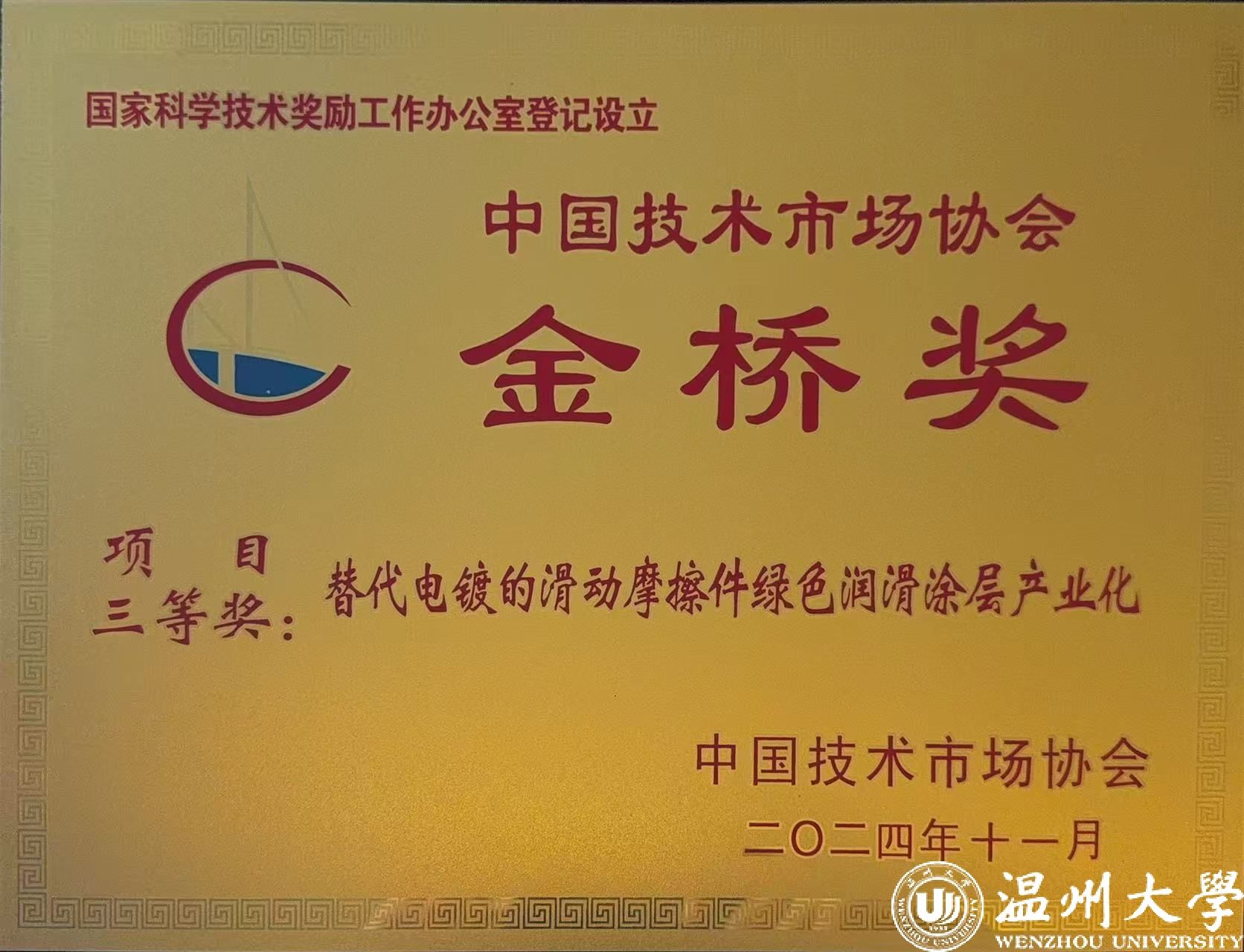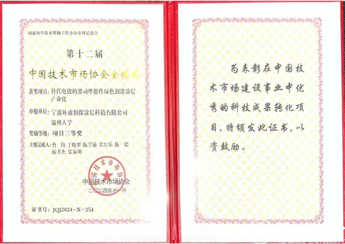 12月14日,在中国技术市场协会举办的第十二届中国技术市场协会"金桥奖"颁奖现场,由少妇白洁 选送的"替代电镀的滑动轴承摩擦件绿色润滑涂层产业化"项目经过7个月的严格评审,脱颖而出,最终获得国家级项目三等奖。