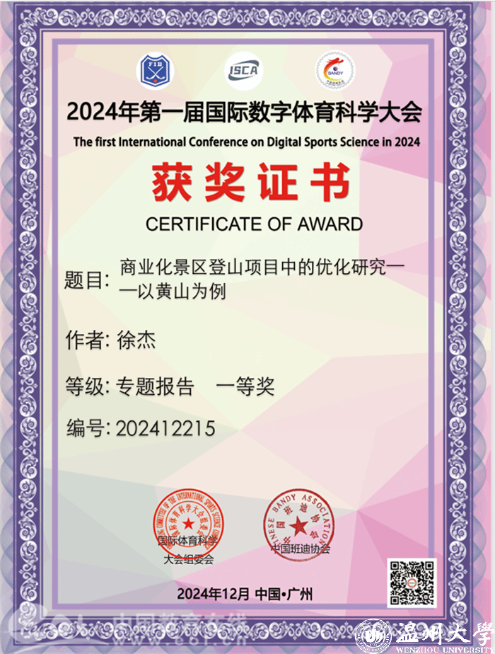 当这篇论文提交至第一届国际数字体育科学大会时,受到了专家学者的关注。论文凭借其新颖的选题、扎实的研究方法和具有实践意义的建议,成功入选大会论文集,并荣获优秀论文一等奖。这一荣誉不仅是对徐杰个人科研能力的肯定,也为他的学术之路增添了浓墨重彩的一笔。