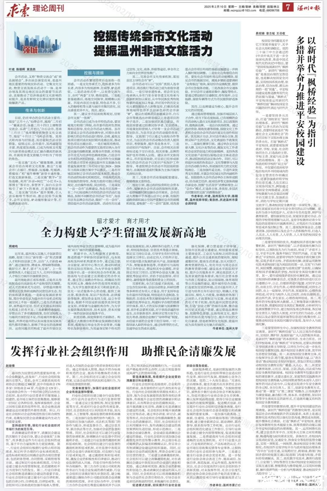 学院党委书记易招娣、学术副院长关震在《温州日报》理论版发表文章
