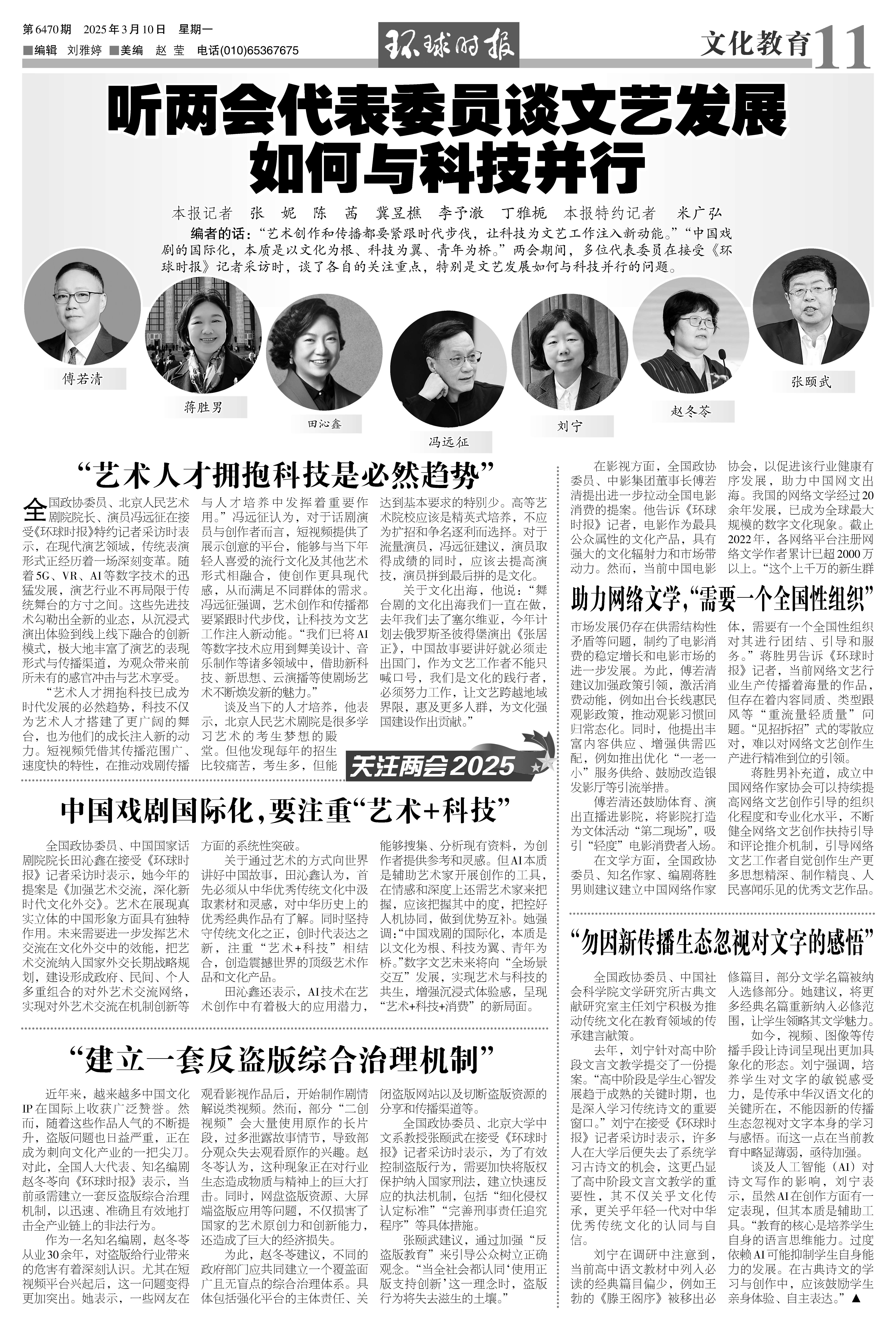 编者的话:“艺术创作和传播都要紧跟时代步伐,让科技为文艺工作注入新动能。”“中国戏剧的国际化,本质是以文化为根、科技为翼、青年为桥。”两会期间,多位代表委员在接受《环球时报》记者采访时,谈了各自的关注重点,特别是文艺发展如何与科技并行的问题。