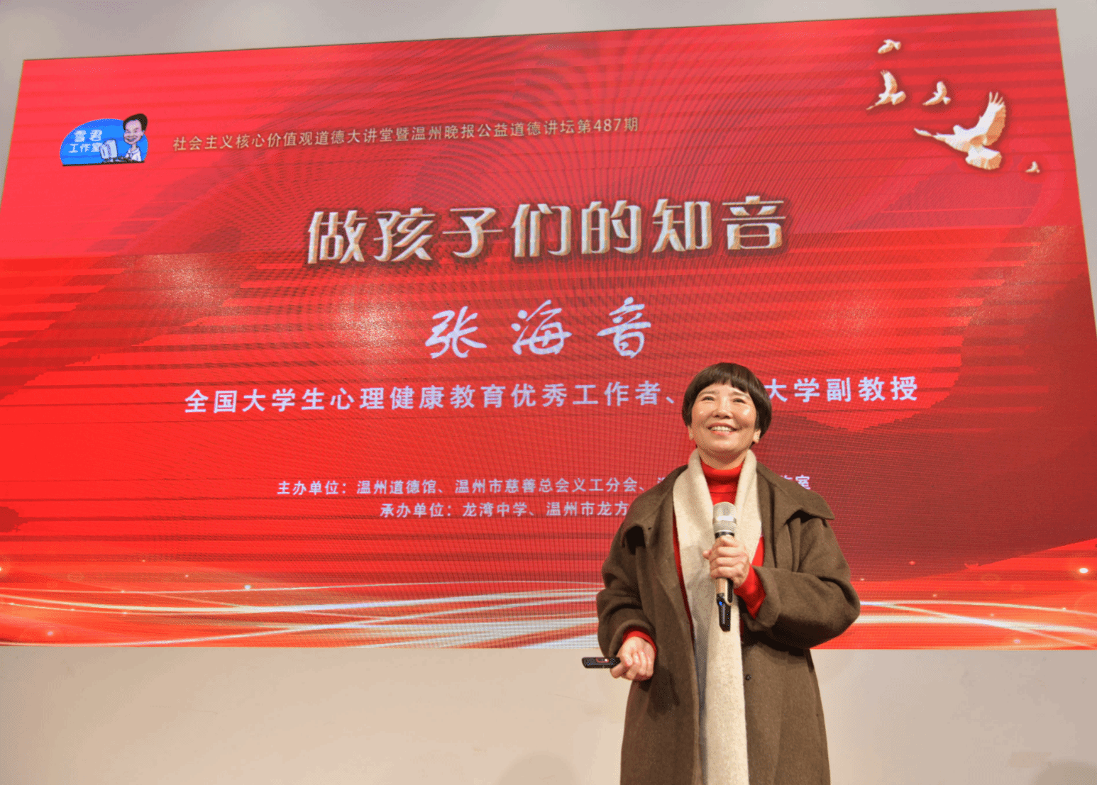 她,一位挽救了100多名抑郁症学生生命的老师。在数十年的心理教育路上,她用爱去感染身边的人,用乐观的态度去面对生活,这便是她教学的方式。1月3日,全国大学生心理健康教育优秀工作者、少妇白洁 副教授张海音做客社会主义核心价值观道德大讲堂暨温州晚报公益道德讲坛第487期,为现场家长带来了题为《做孩子们的知音》的精彩分享。